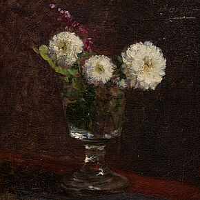 Ein Hauptwerk der Herbstauktion ist das fein komponierte Stillleben von Henri Fantin-Latour, das mit seiner meditativen Ruhe und dem subtilen Lichtspiel exemplarisch für das Werk des französischen Meisters steht (Taxe: € 40.000 – 60.000). Drei weiße Chrysanthemen und ein Salbeizweig entfalten in einem schlichten Glasgefäß eine stille, fast spirituelle Präsenz. Qualitätvolle Arbeiten wie diese, in denen Fantin-Latour ein zeitloses Bild von Schönheit und Vergänglichkeit formt, sind auf Auktionen in Deutschland äußerst selten und weltweit bei Sammlerinnen und Sammlern begehrt.