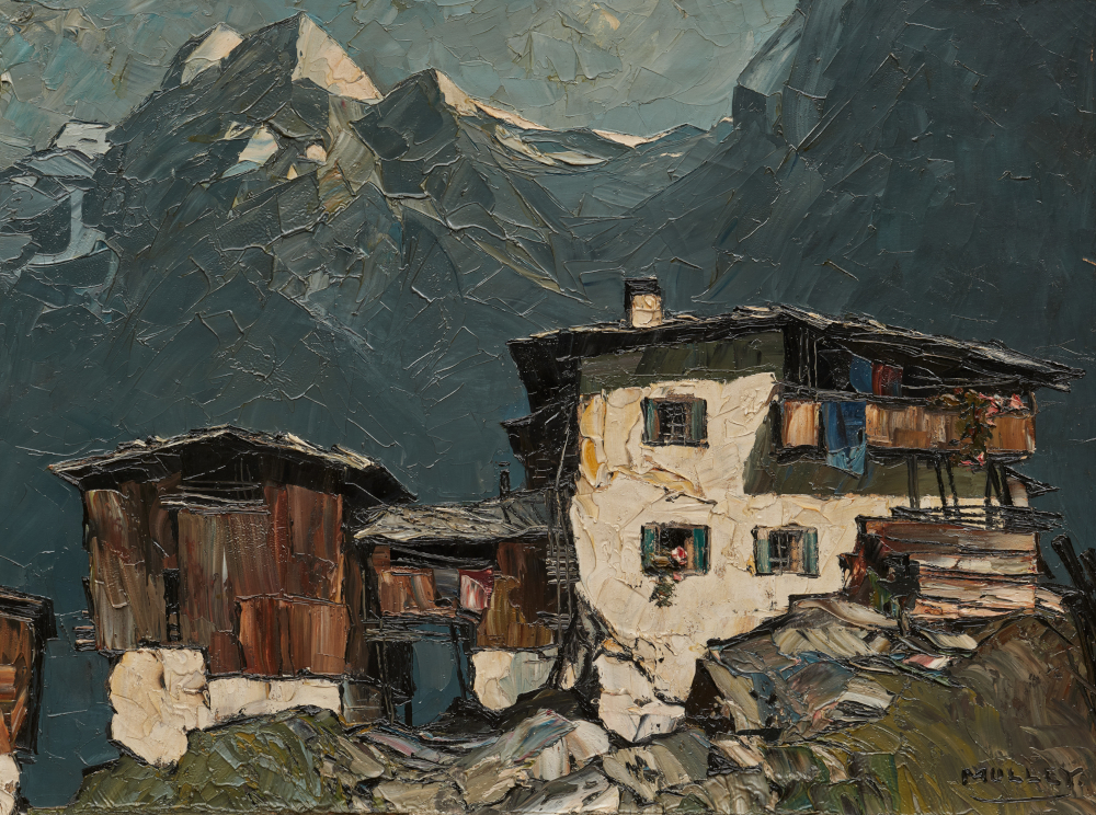 Bauernhof vor mächtigem Hochgebirge | Öl auf Leinwand | 76 x 99,5 cm