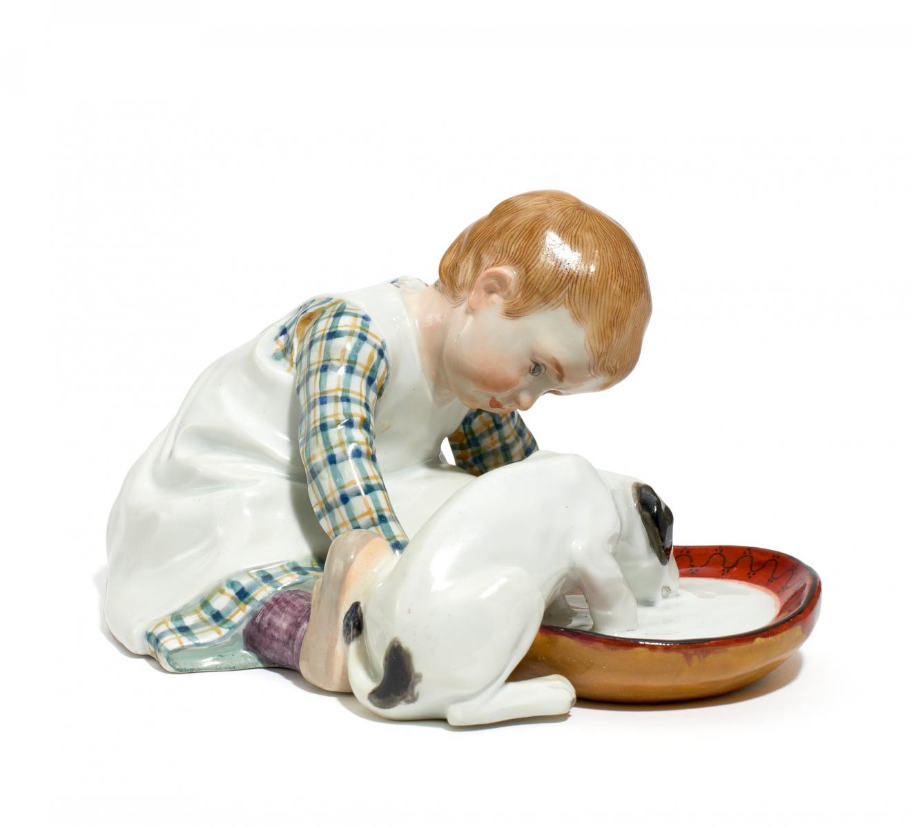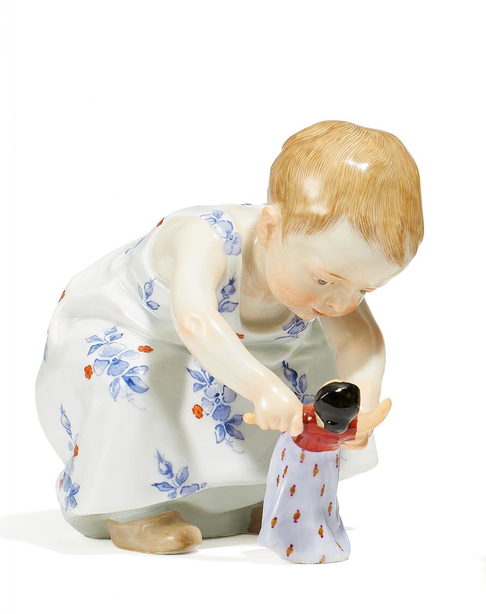 Julius Konrad Hentschel, geboren 1872, ist einer der bedeutendsten Künstler des Meissener Jugendstils. Seit 1897 für die Manufaktur tätig, begeistert er schon vor 1900 mit seinen Service Entwürfen wie dem Krokus-Dejeuner. Er verstand es „Jugendstilformen, Dekor, Funktion und materialgerechte Gestaltung harmonisch zu verbinden“. Dieses Konzept verfolgt er auch bei seinen beliebten ab 1904 bis zu seinem Tod 1907 entstandenen und bis heute produzierten bezaubernden Kinderfiguren. Die Kinder, dargestellt in einer Momentaufnahme des kindlichen naiven Spiels, in dezenten Aufglasurfarben und schlichter Ausführung entführen den Betrachter in die scheinbar heile Welt um die Jahrhundertwende. Einige der sogenannten „Hentschelkinder“ entstanden ursprünglich in Verbindung mit Schreibtischgarnituren als Dekoration für den Arbeitstisch.