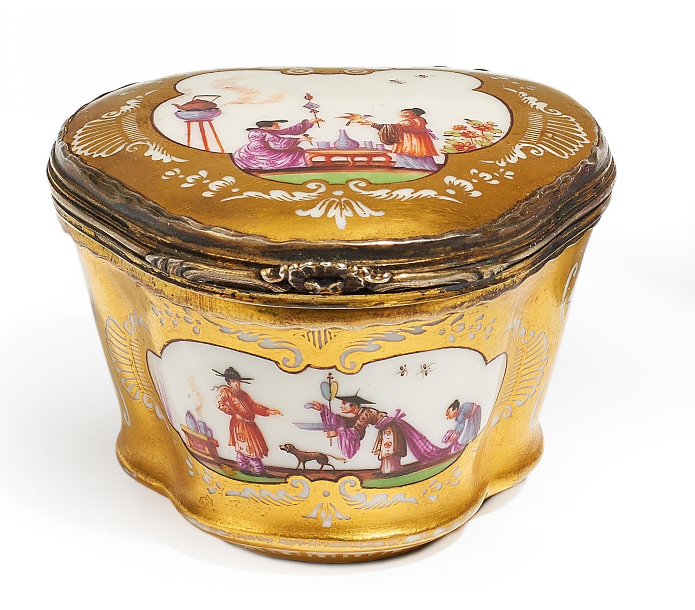 Im 18. Jahrhundert war Schnupftabak das Genussmittel der Wahl für die vornehme Gesellschaft geworden. Seine Einnahme war ein gesellschaftliches Ritual, für das natürlich auch entsprechende Accessoires entwickelt wurden, mit denen man seinen guten Geschmack und Status zur Schau stellen konnte. Zur Aufbewahrung des Tabaks dienten kleine Dosen, die aus unterschiedlichen, kostbaren Materialien wie z.B. Emaille, Porzellan, geschnittenen edlen Quarzen wie Achat oder Jaspis aber auch aus Silber gefertigt wurden. Besonders Wertvolle Dosen wurden vergoldet und/oder mit Edelsteinen besetzt. Bei der Gestaltung dieser Kleinode, ob mit gemalten Motiven, Reliefdekoren oder gar als figürliche Dosen, war der Phantasie der Kunsthandwerker keine Grenze gesetzt.