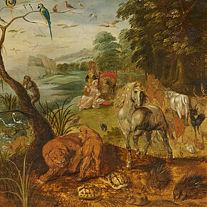 Das beeindruckende Gemälde mit einer Paradieslandschaft mit dem Einzug der Tiere in die Arche Noah gilt als das letzte Meisterwerk des flämischen Meisters Jan Breughel der Jüngere (Taxe: € 150.000 – 300.000). Für Dr. Klaus Ertz, der die Arbeit im Original studiert und begutachtet hat, sprechen die in ihrer Ausführung freieren Details und der flüssigere Stil, der die Farbe der Zeichnung vorzieht, für die späte Entstehungszeit. Das Werk ist als Variation eines Prototyps mit demselben Thema zu verstehen, den sein Vater Jan Brueghel der Ältere (heute im Szépmüveszéti Muzeum in Budapest) ausgeführt hat. Die Neuinterpretation einer erfolgreichen Komposition wie des Paradieses ist in der flämischen Malerei dieser Zeit nichts Neues, sondern durchaus üblich. Das Erstaunliche und Faszinierende an diesem majestätischen Gemälde ist sein ungewöhnliches Format. Dies lässt vermuten, dass es von einem Schlossherrn in Auftrag gegeben wurde, der über Räume von entsprechender Größe verfügte.
