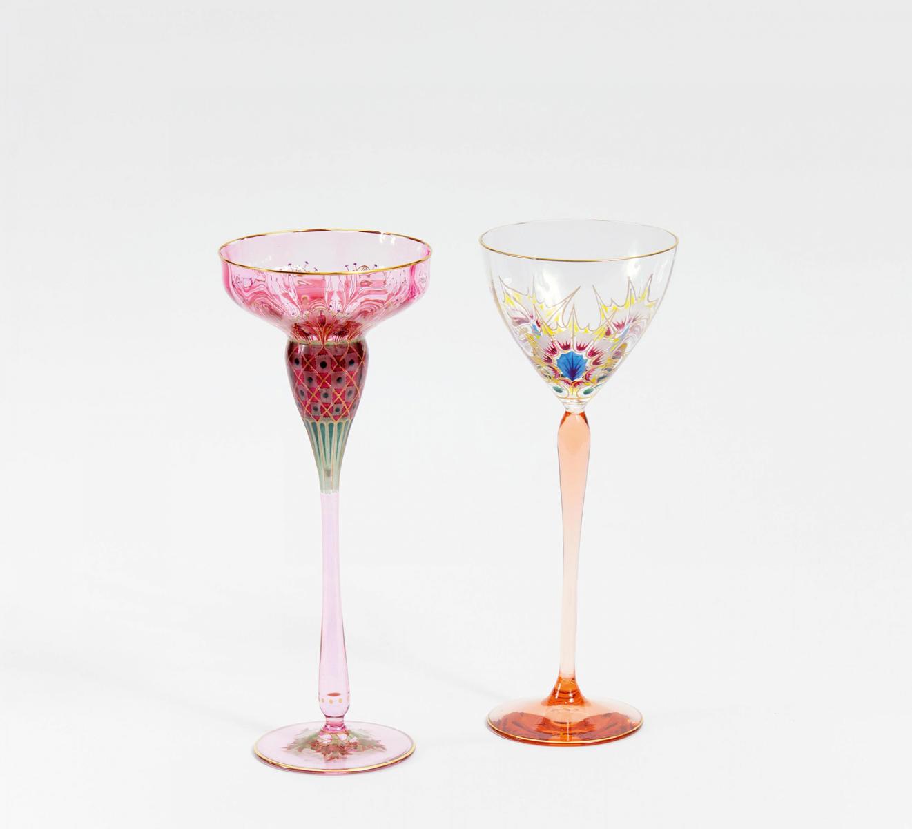 Material: Rosafarbenes und rauchbraunes Glas, farbig und gold dekoriert.