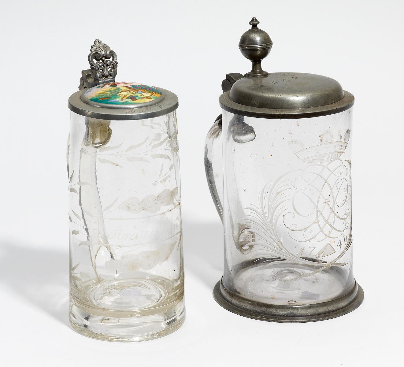 Technik: Glas graviert. Zinndeckel.