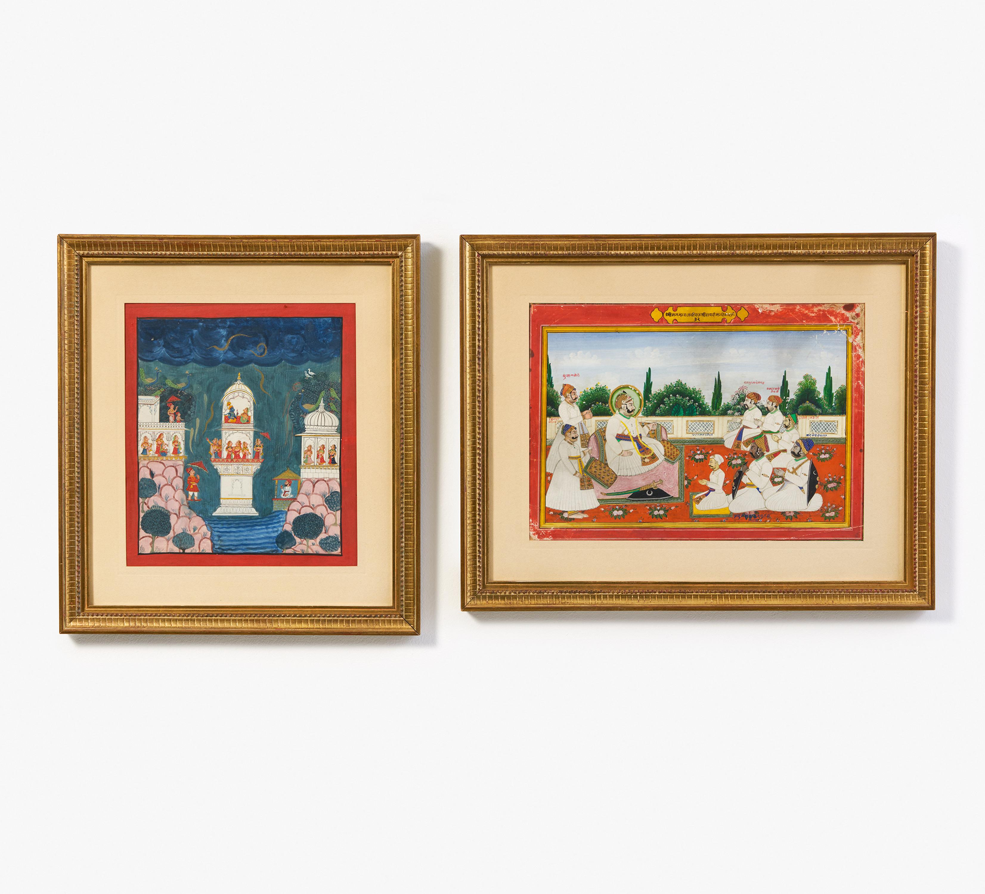 Maße: Maharadja Madher Singh Ji - 22x35cm, Rahmengröße 43,5x54,5cm. Krishna und Radha bei Monsum im Palast - 27x23,5cm, Rahmengröße 47x42cm.