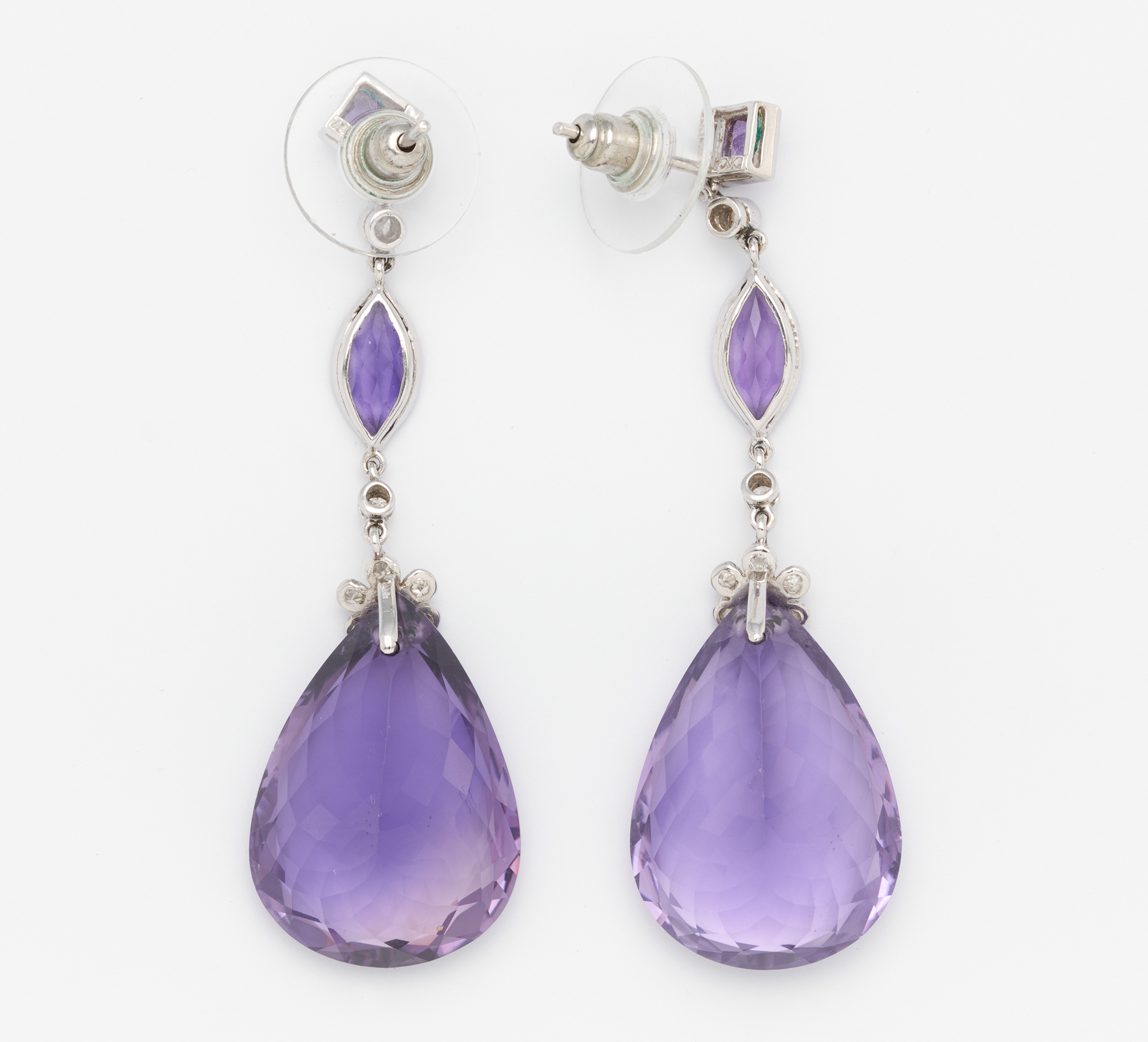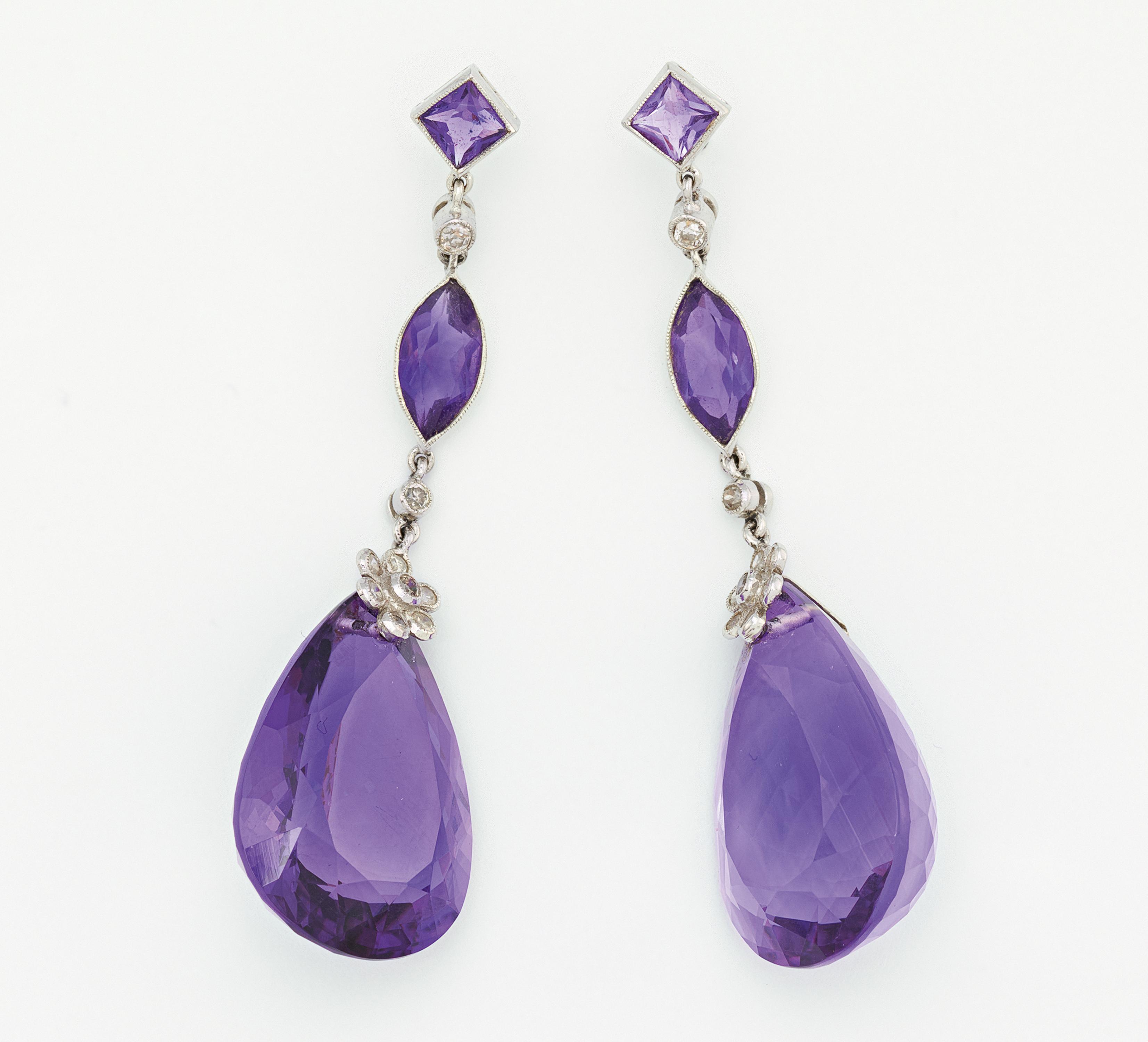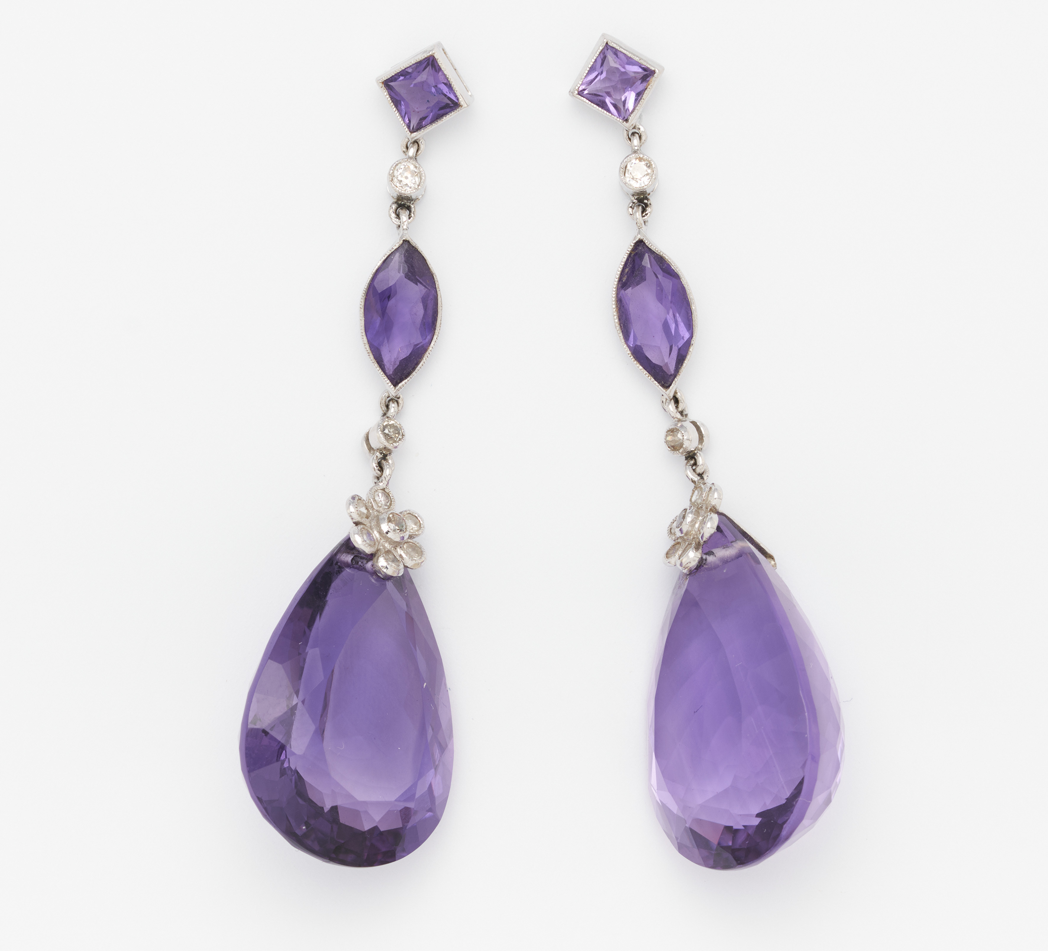 Guter Allgemeinzustand. Beide Amethyst-Tropfen haben kleine Beschädigungen.