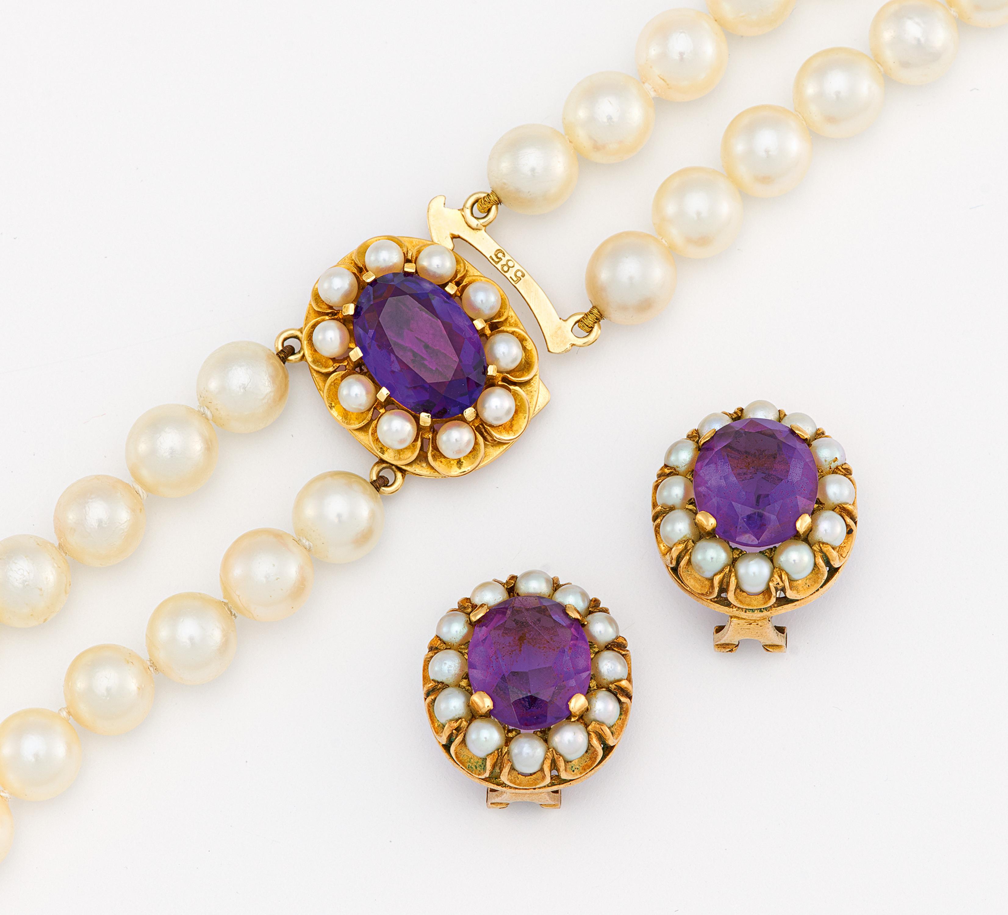 Org. Substanzen: 105 runde Akoya Zuchtperlen Ø ca. 7,7 mm, weiß-crème, 34 kleinere runde Zuchtperlen, Ø 2,8 mm.