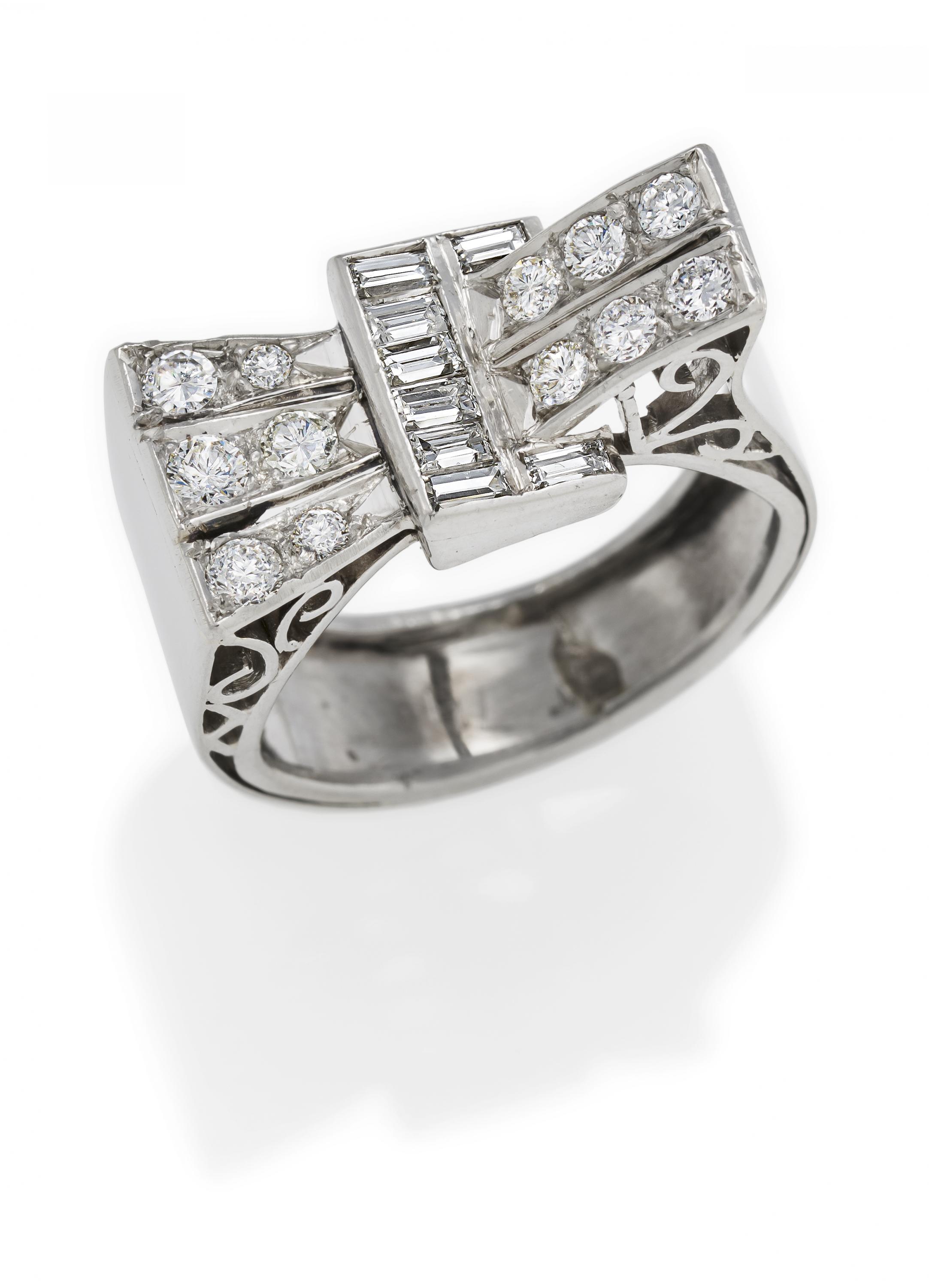 Diamanten: 20 Diamanten im Brillant- und Baguette-Schliff zus. ca. 0,6 ct., überwiegend H-I/VS, 1 Brillant M.