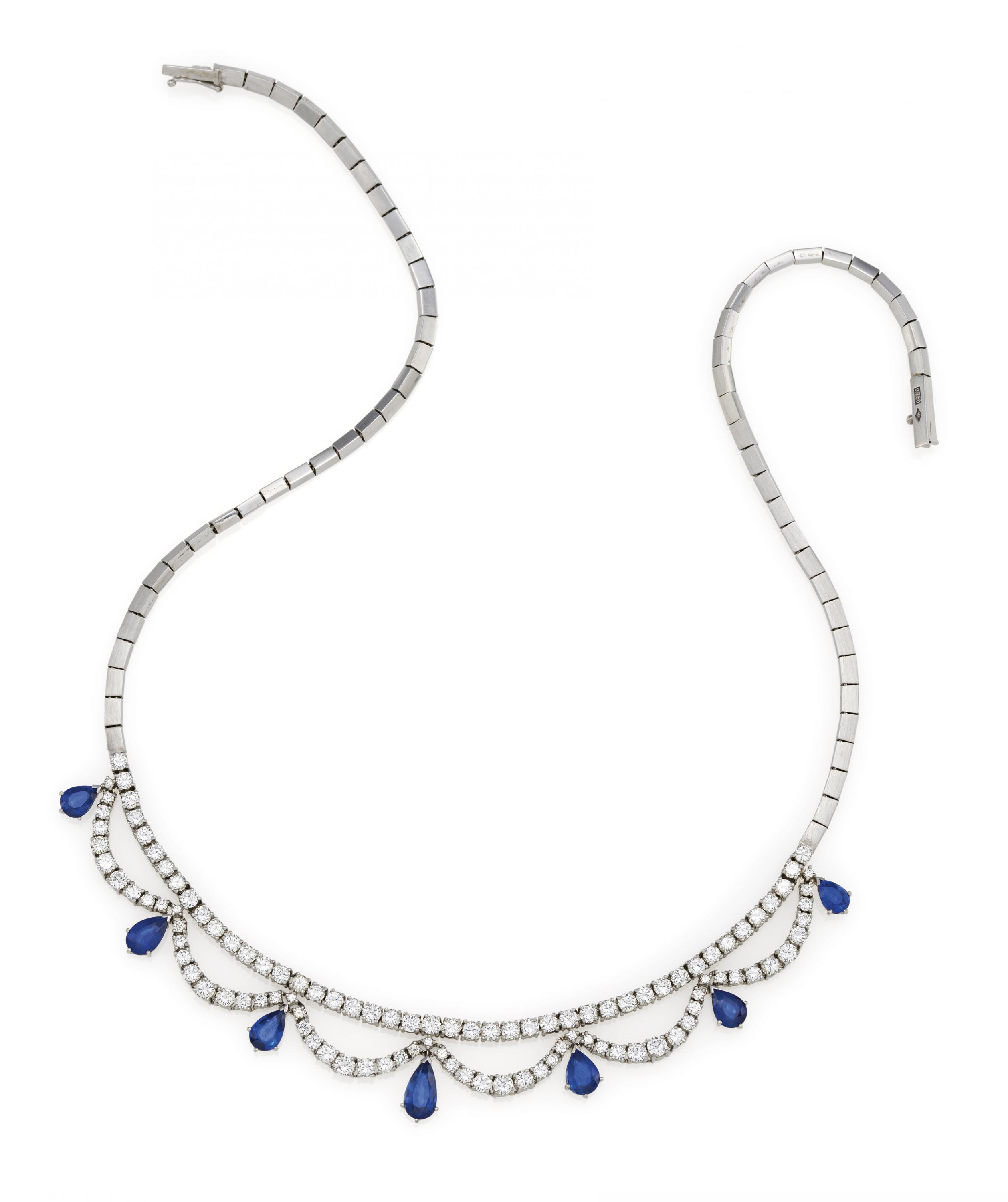 Reihe girlandenförmig mit dazwischen gehängten Saphir-Tropfen.