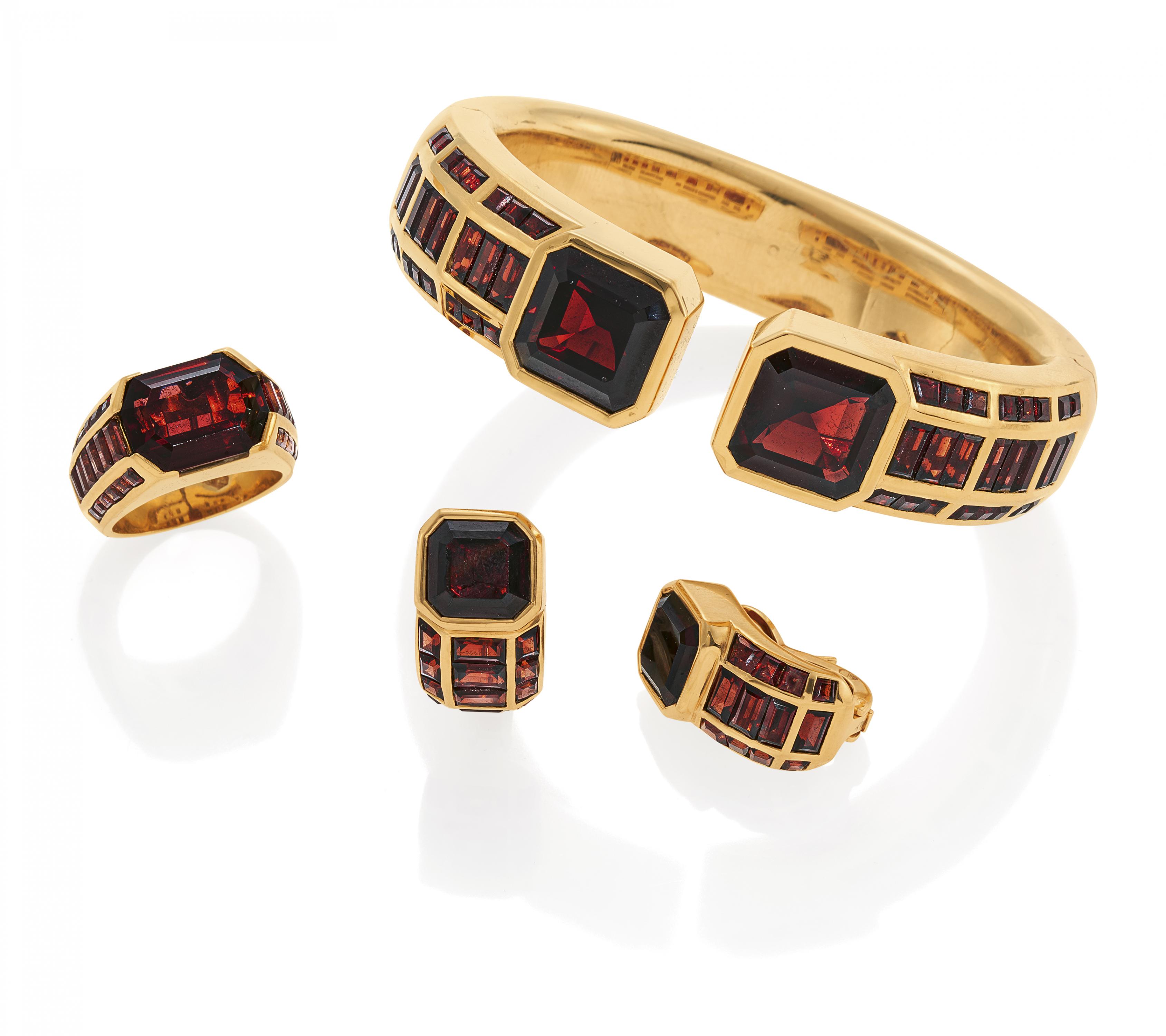 MALAYA-GRANAT SET: ARMREIF, RING UND OHRSTECKCLIPS.