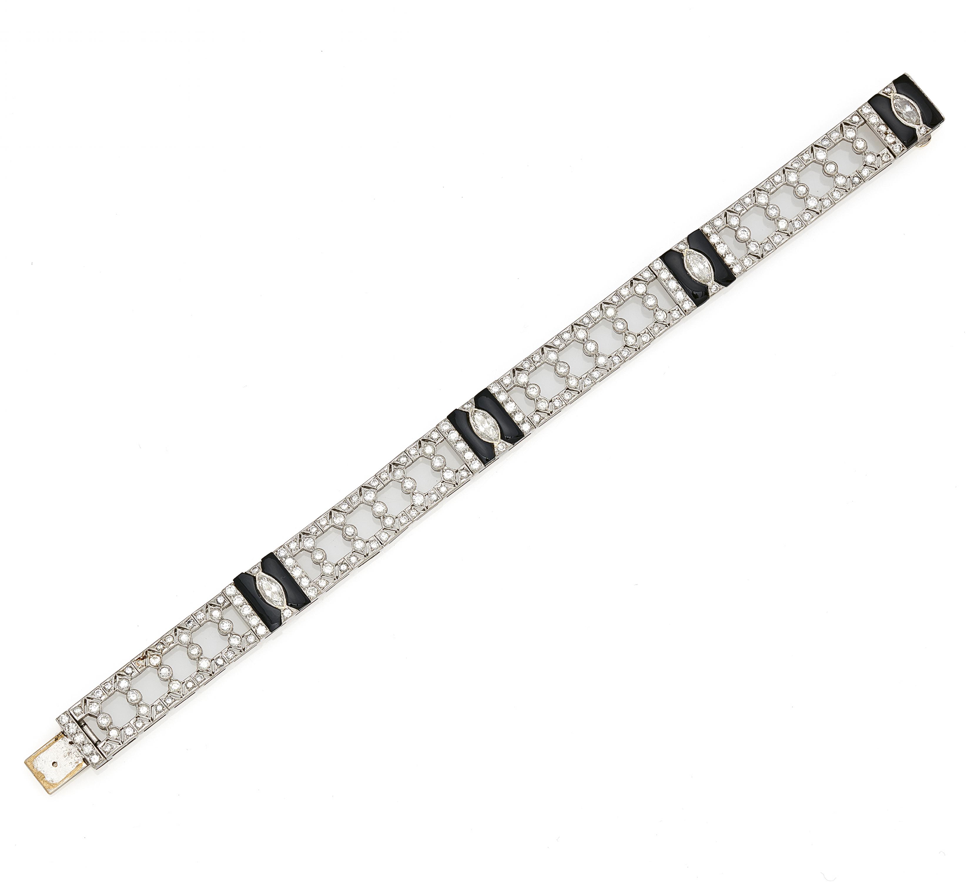 Edelsteine: 8 Onyx-Elemente Länge 10,21 mm, welche die Diamant-Navetten umrahmen.