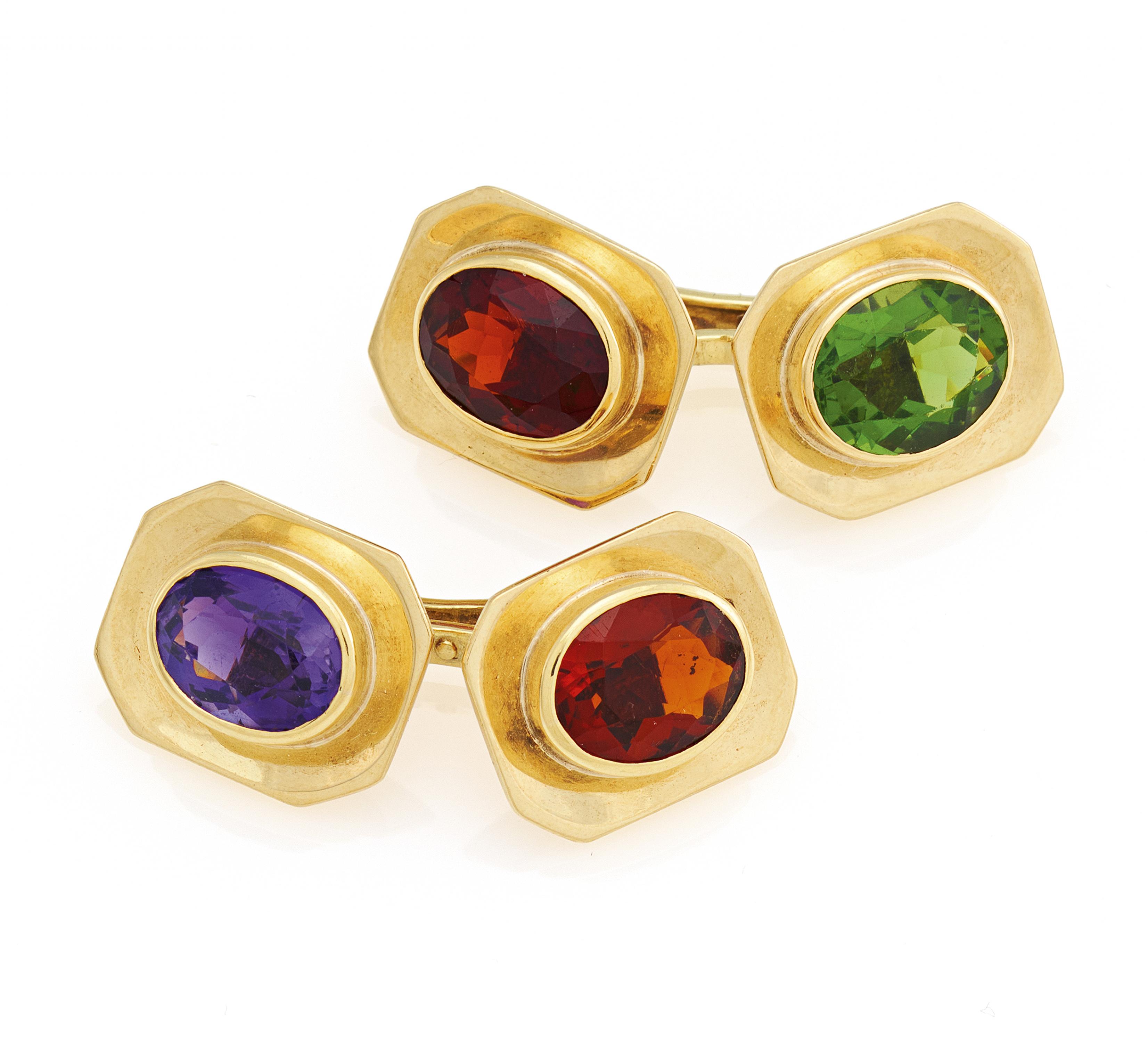 Edelsteine: 1 Amethyst, 2 Citrine, 1 Farbstein, wohl Moldavit, zus. ca. 6,0 ct.