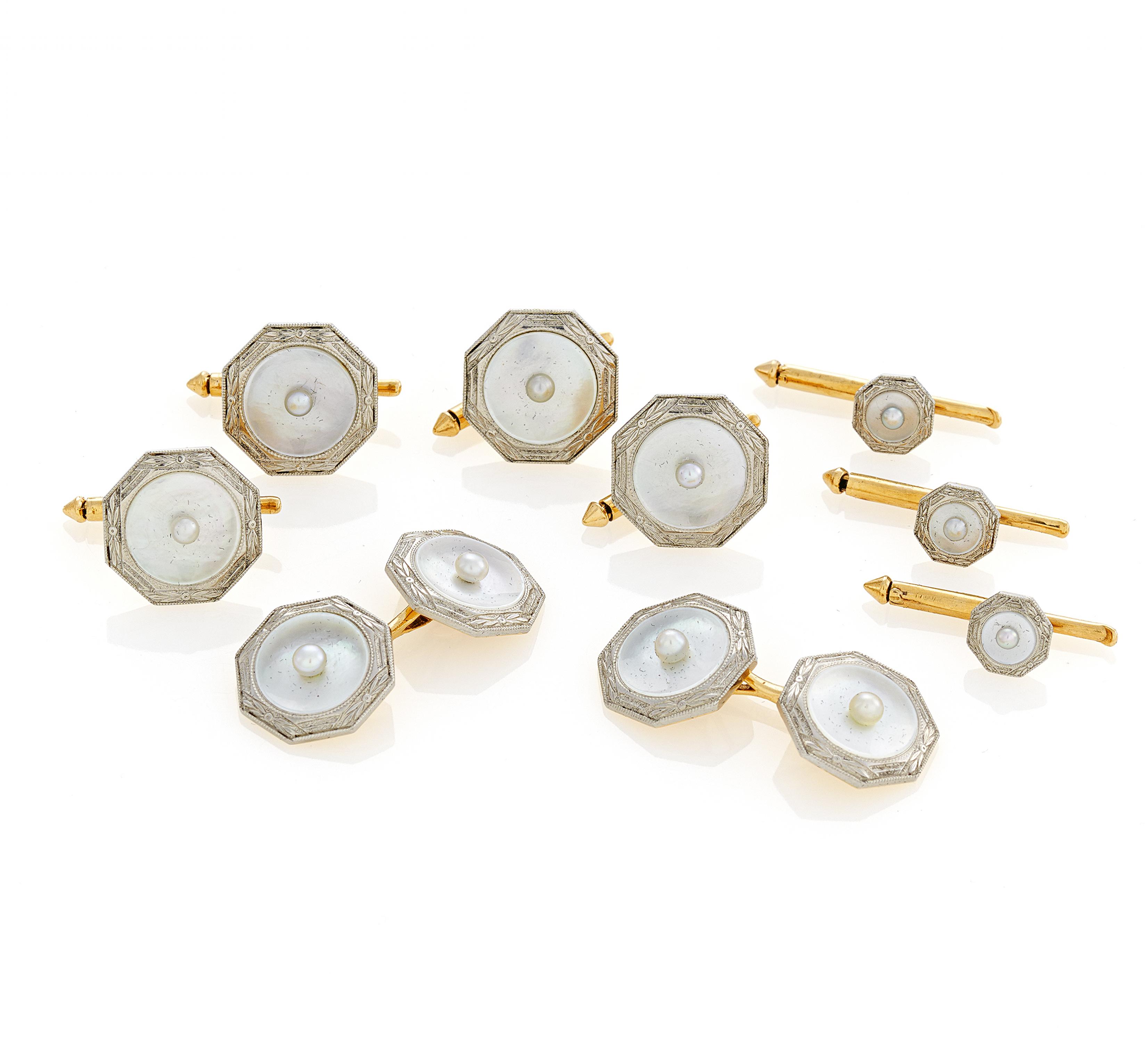 Beschreibung: Garnitur bestehend aus einem Paar Manschettenknöpfe, vier Smoking- und drei Frackknöpfen.