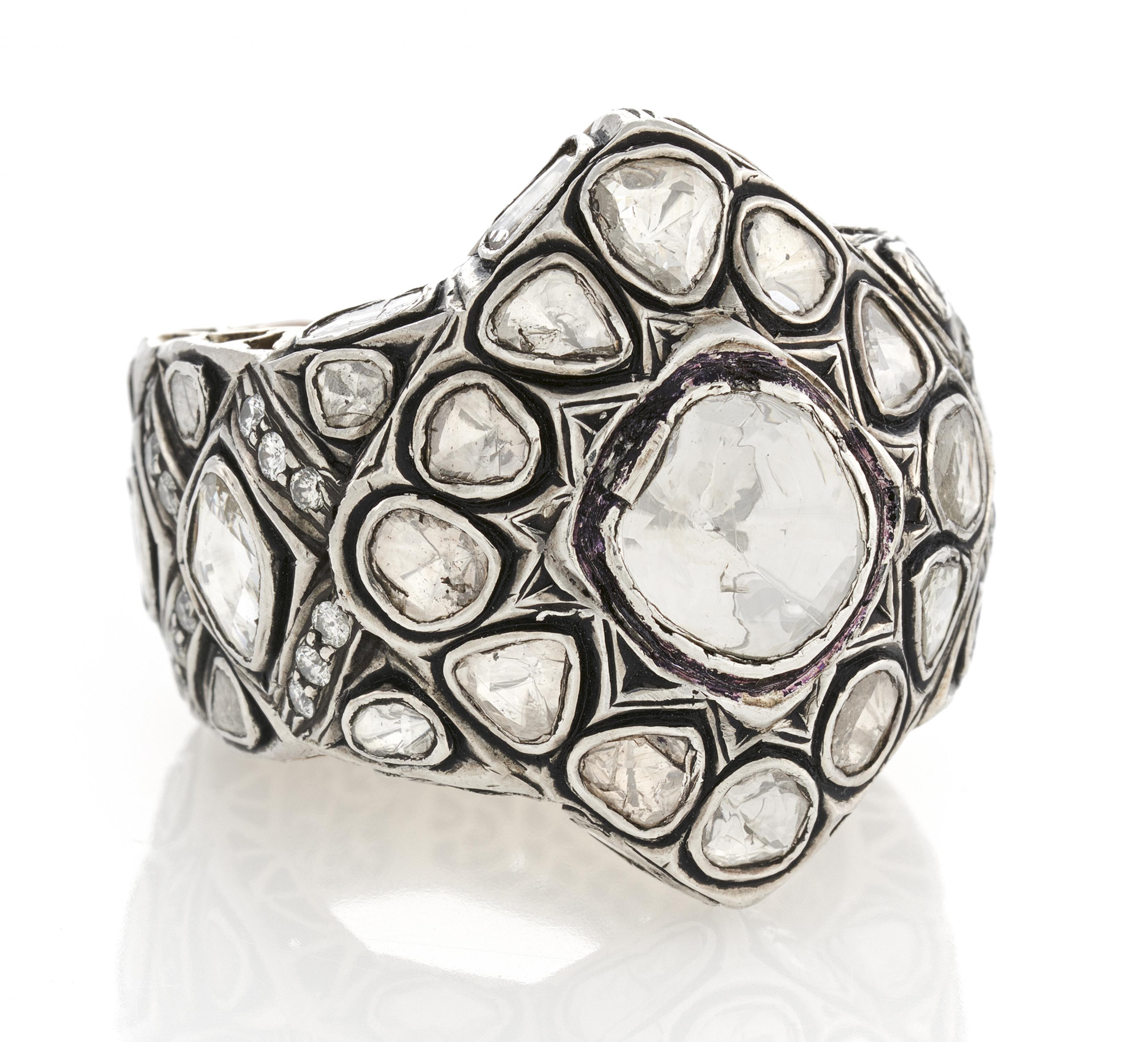Diamanten: Ca. 43 facettierte Diamanten Ø ca. 1,8 - 8,6 mm, Farbe und Reinheit kann aufgrund der Fassung nicht beschrieben werden, ca. 47 kleine Brillanten Ø ca. 1,3 mm.