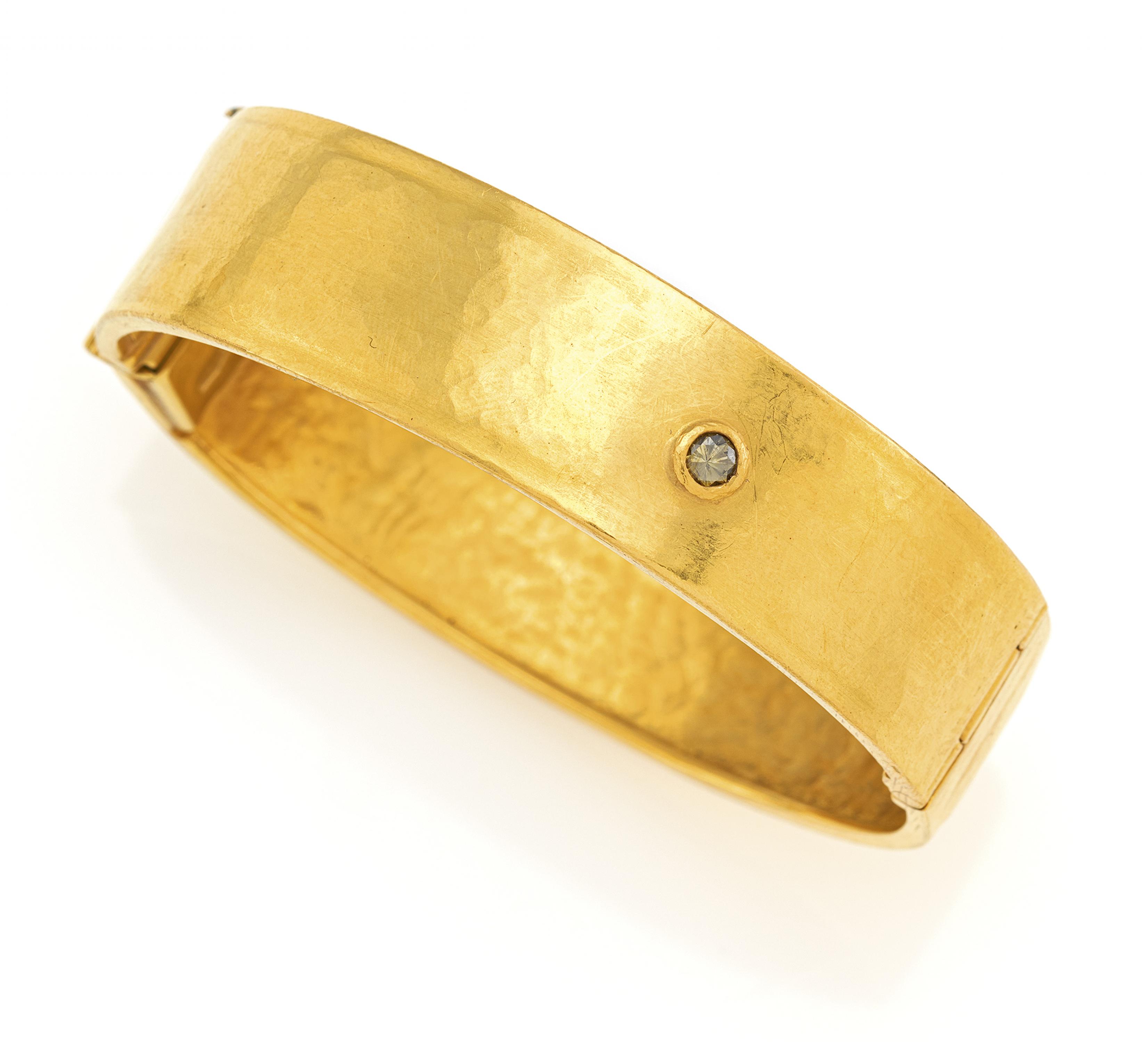Beschreibung: Der Diamant ist rückseitig geschlossen gefasst. Der Armreif mit schöner, martellierter