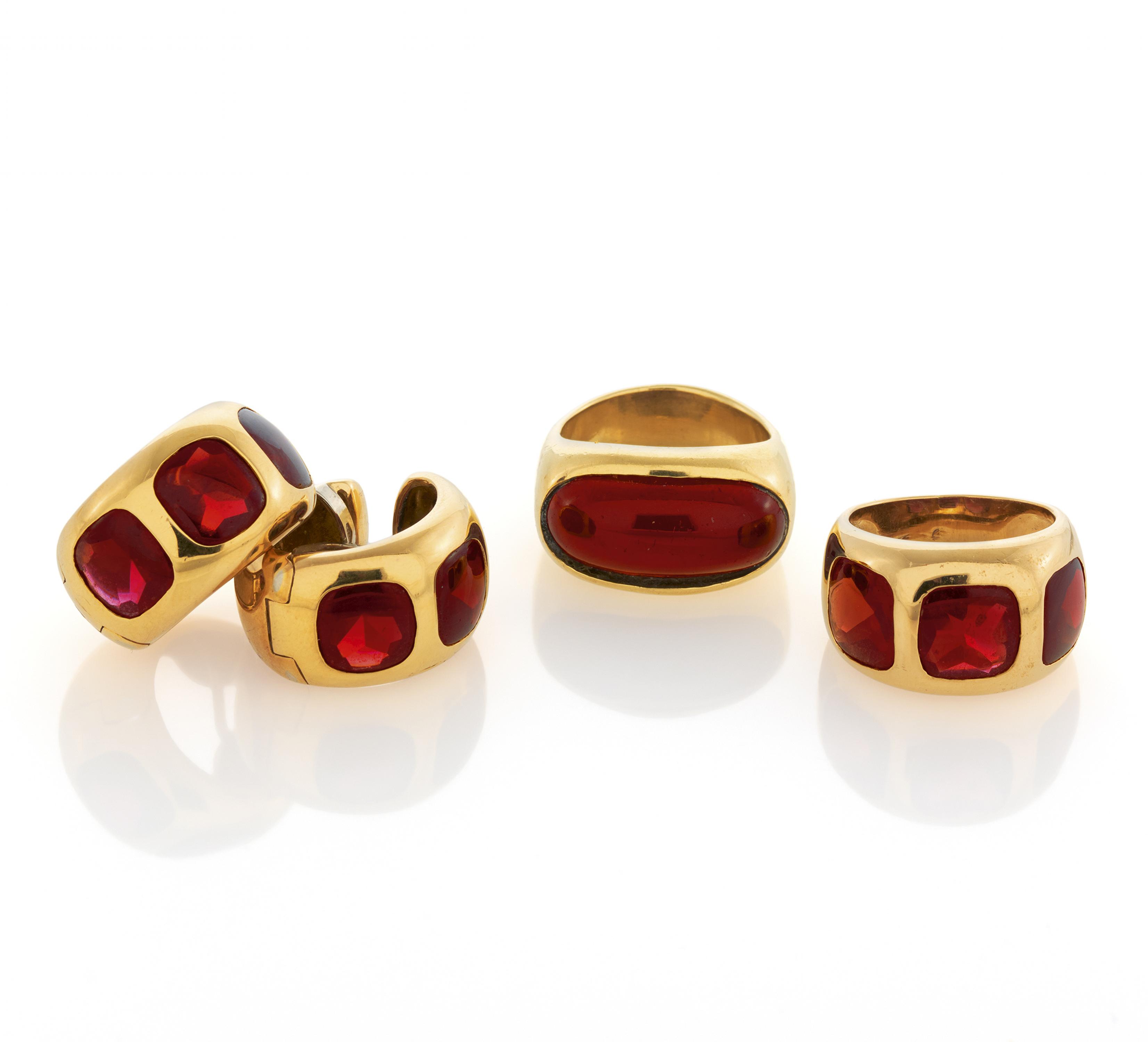 FARBSTEIN SET: 2 RINGE UND OHRCREOLEN.