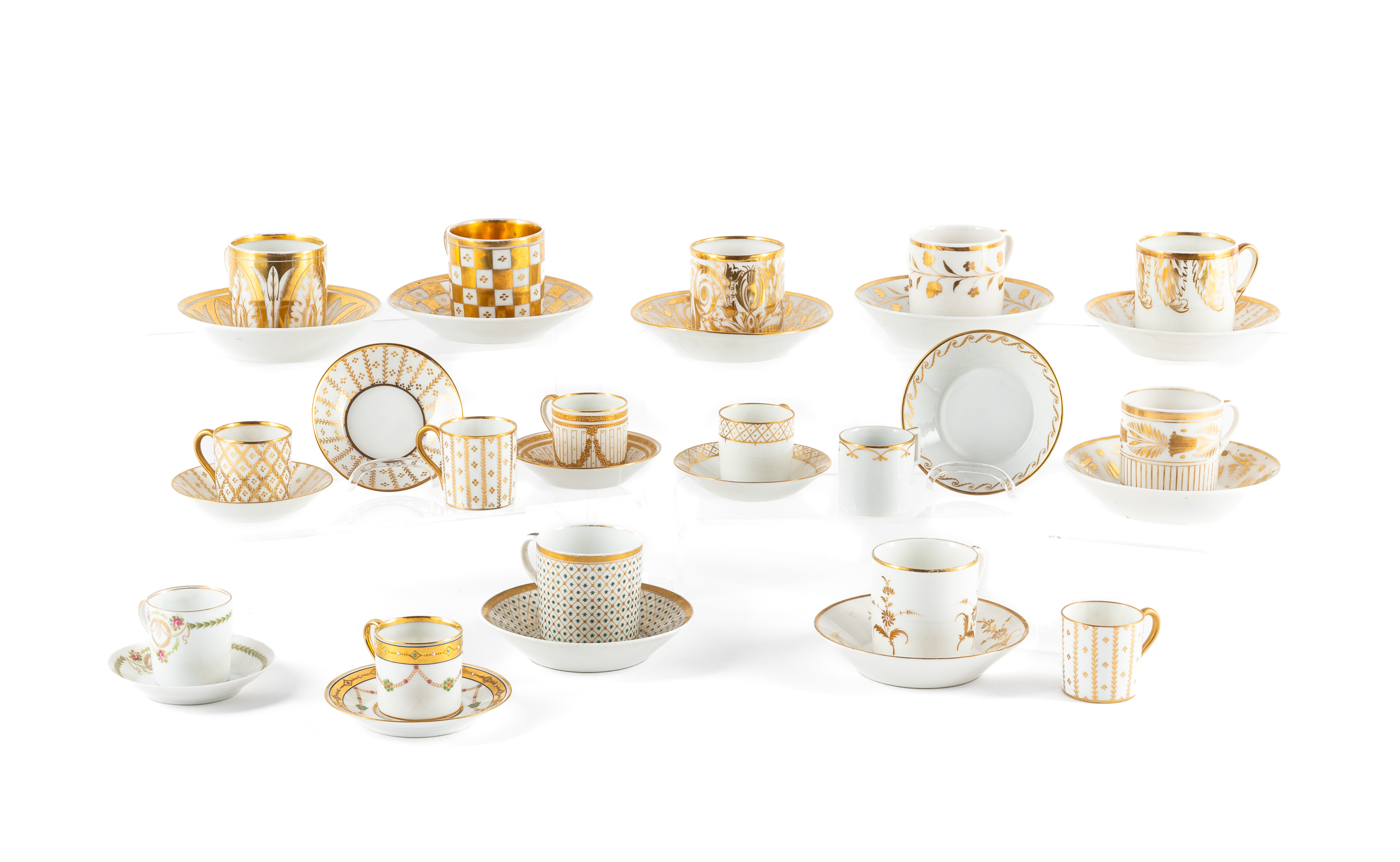 ACHT GOLDDEKORIERTE MOKKATASSEN MIT UNTERTASSEN & ACHT GOLDDEKORIERTE KAFFEETASSEN MIT UNTERTASSEN.