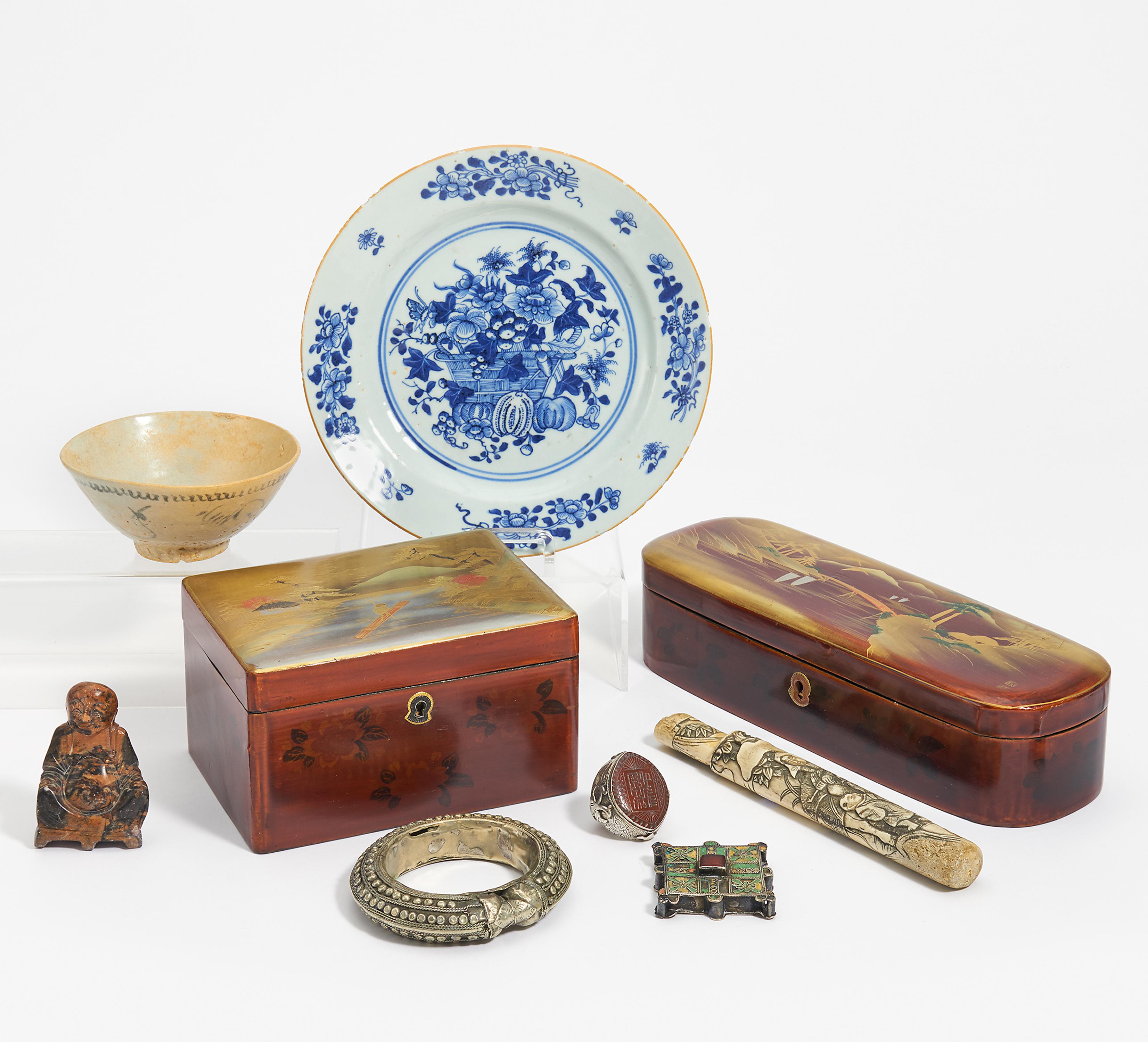 Beschreibung: a) Teller. Porzellan, unterglasurblau. China. 18.Jh. Ø 23,5cm. Rand bestoßen. b) Schale. Steinzeug, unterglasurblau bemalt. China. 18./19. Jh. Ø 13,5cm. Riss an der Lippe. c) Buddha. Rot-schwarzer Speckstein. China. H.8,5cm. d) Pfeifenetui kizersutsu. Knochen. Japan. L.21,5cm. d) 2x Lackdosen. Japan. H.10cm, 17,5x13cm/H.7. 30x10,5cm. e) Armreif. Silber in Repoussé. Afghanistan. Ø 10,8cm. f) Ring mit dunkelrotem Stein. L.4,5cm. g) Amulettanhänger mit Email. Nordafrika. 5,7x5,7cm. g)