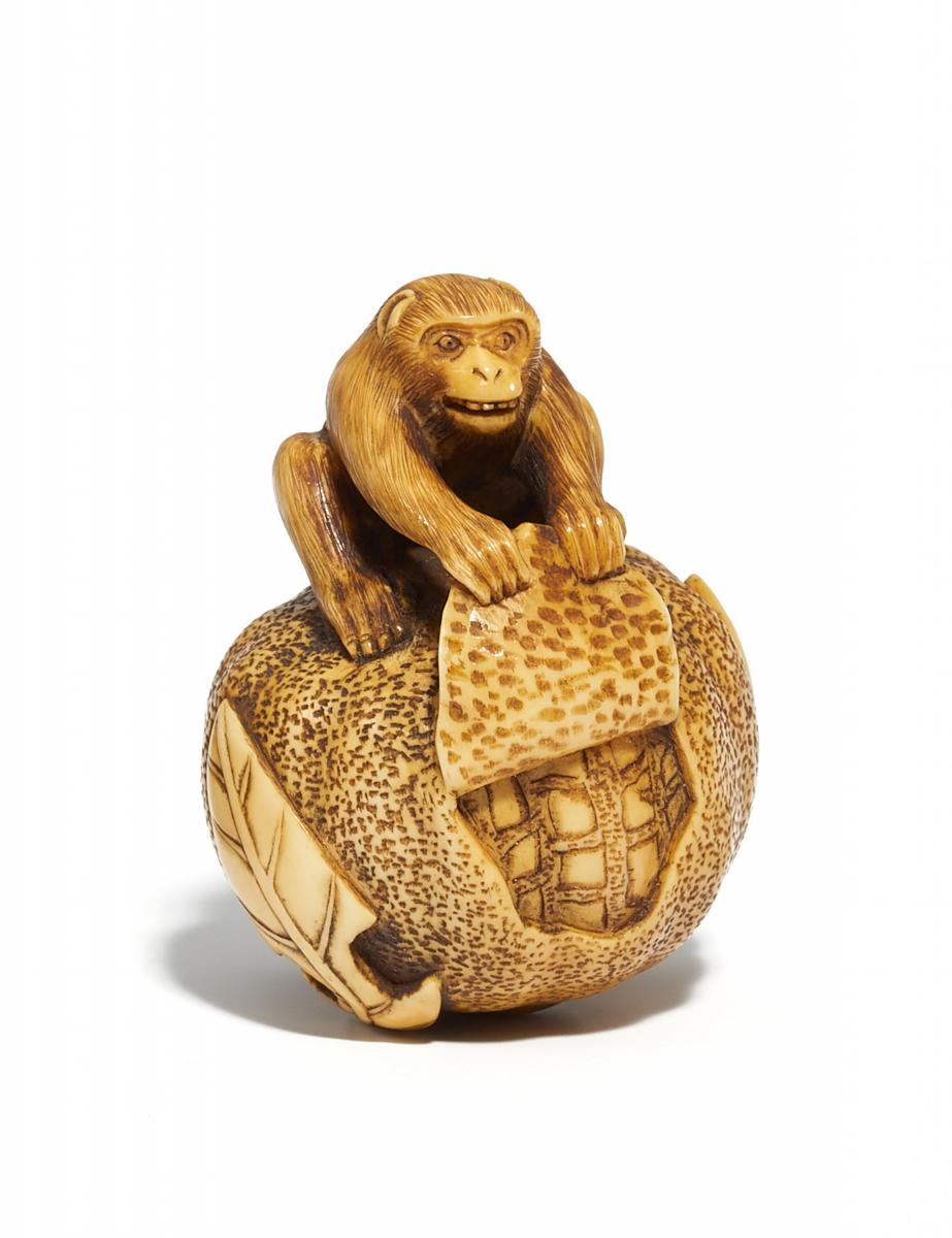 Technik: Elfenbein, fein geschnitzt und graviert, teils punziert und dunkel eingefärbt.