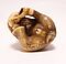 Beschreibung: Das hockende, männliche Tier in einen großen Pfirsich beißend, den es an seinem Stiel