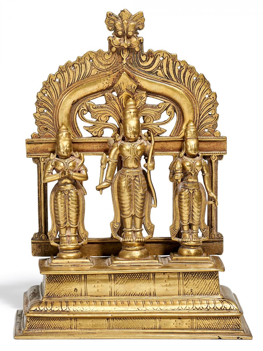ALTARGRUPPE MIT RAMA, LAKSHMANA UND SITA. MESSING.