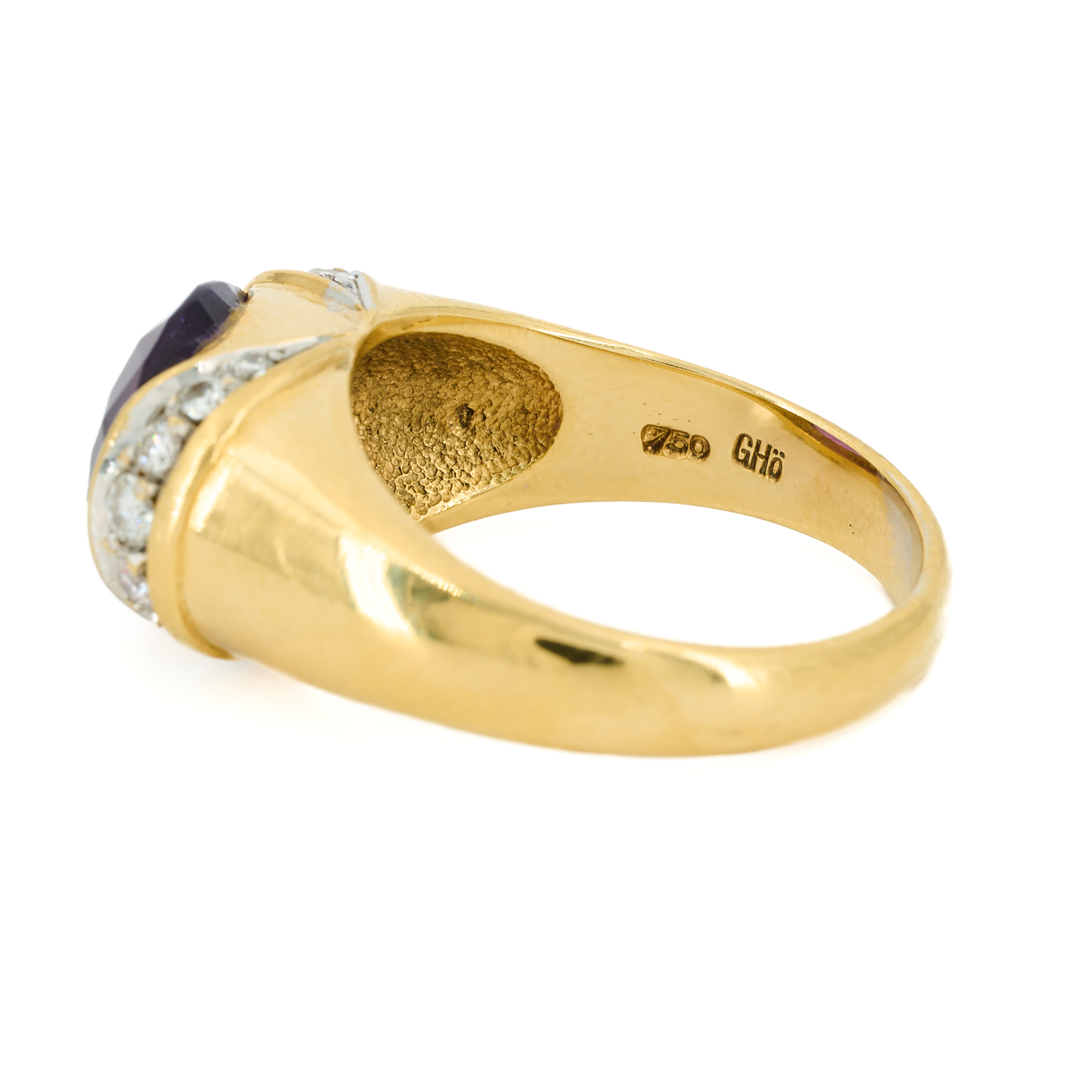 Beschreibung: Symmetrischer Gelbgoldring mit zentralem Amethyst, flankiert von geschwungenen Weißgold-Elementen, die mit Brillanten besetzt sind. Juwelierpunze "GHÖ".