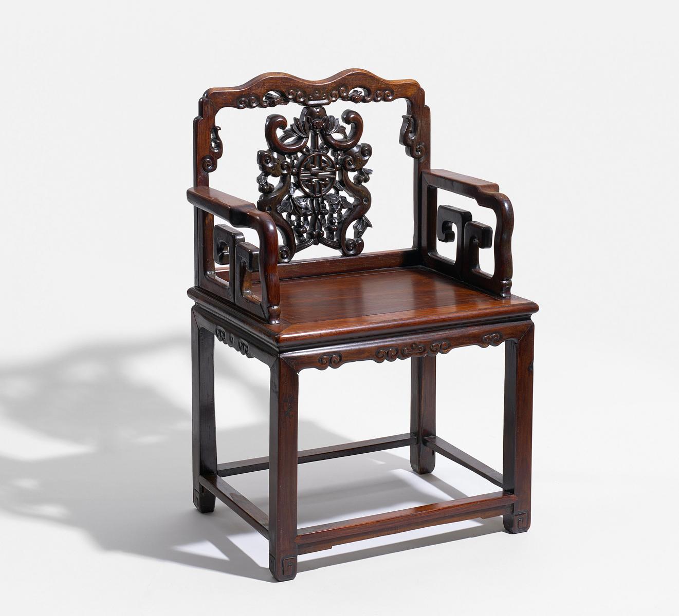 Die Rückenlehne ist durchbrochen geschnitzt mit einem runden shou-Zeichen, das von einer