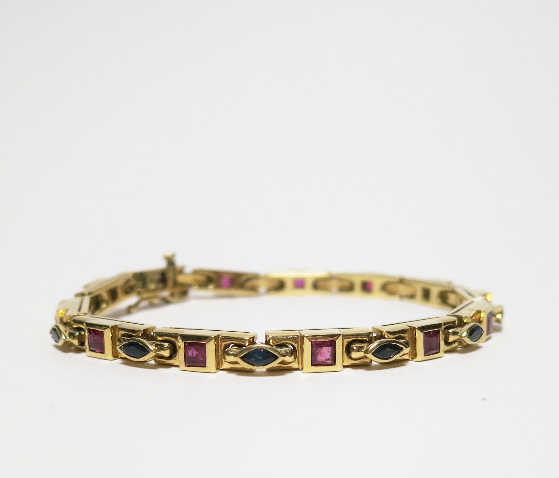 Edelsteine: 13 rote Farbsteine im Karrée-Schliff Ø ca. 3,0 mm, 13 Saphir-Navetten ca. 4,6 x 1,6 mm.