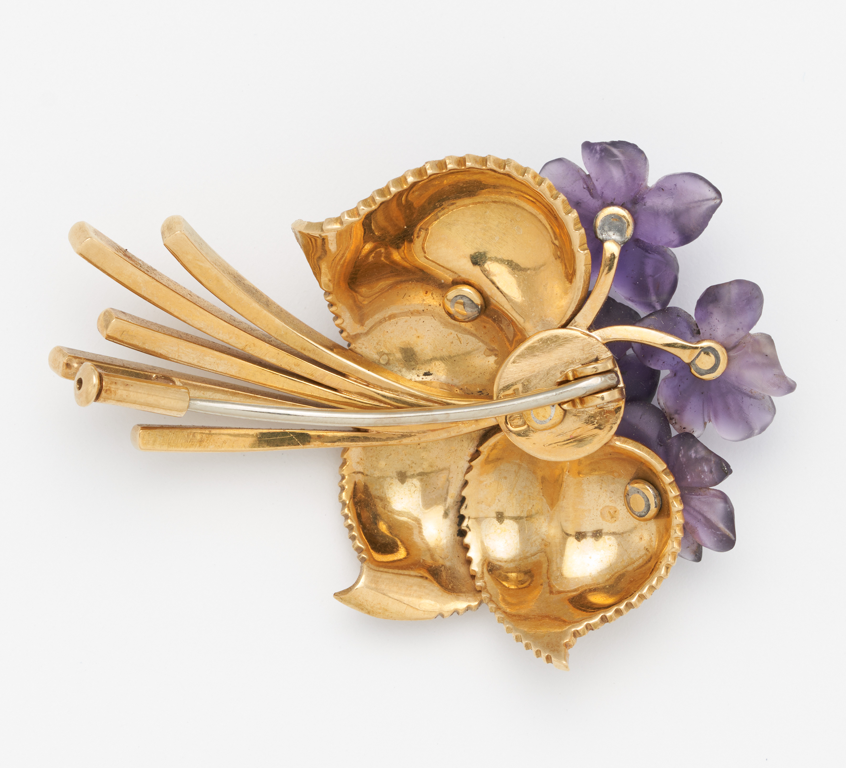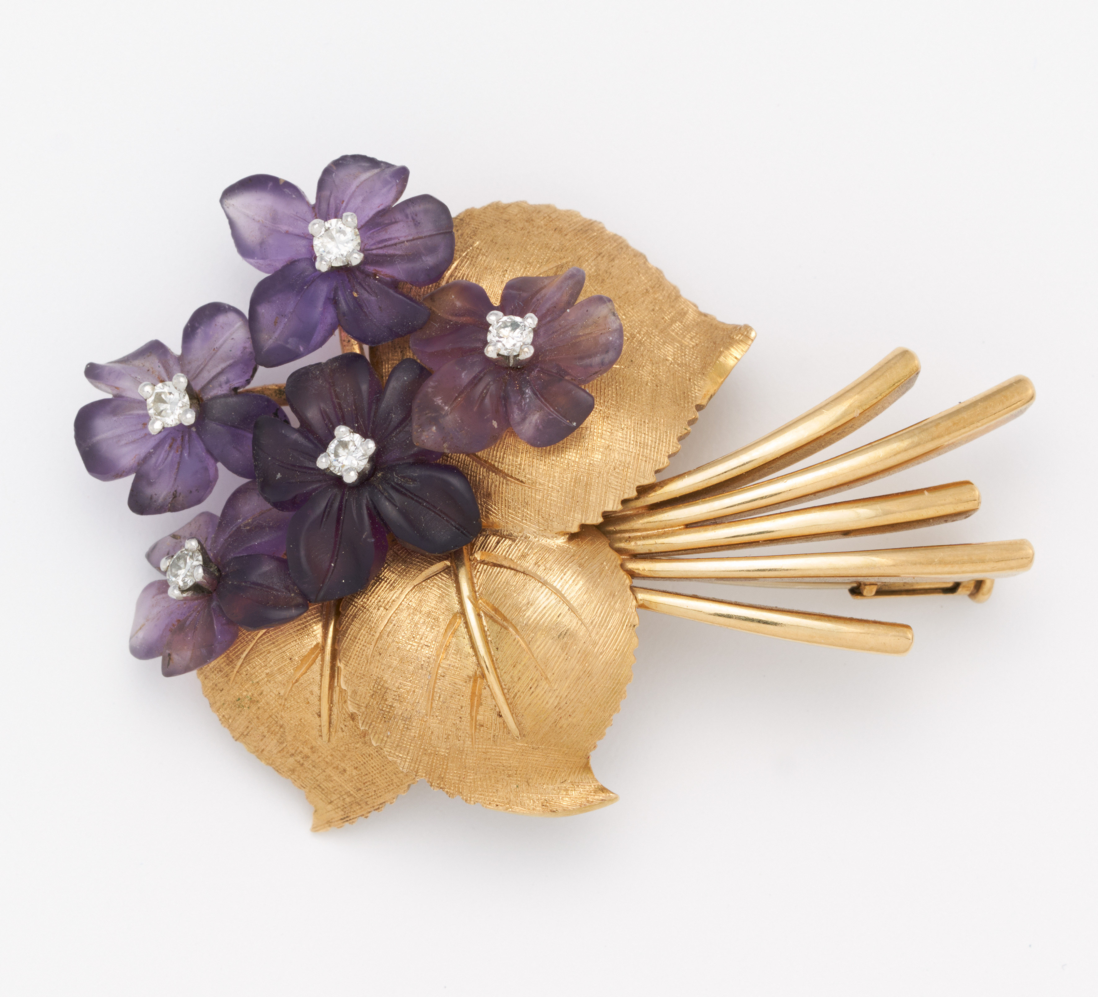 Edelsteine: 5 geschnitze Amethyste in Form von Blüten.