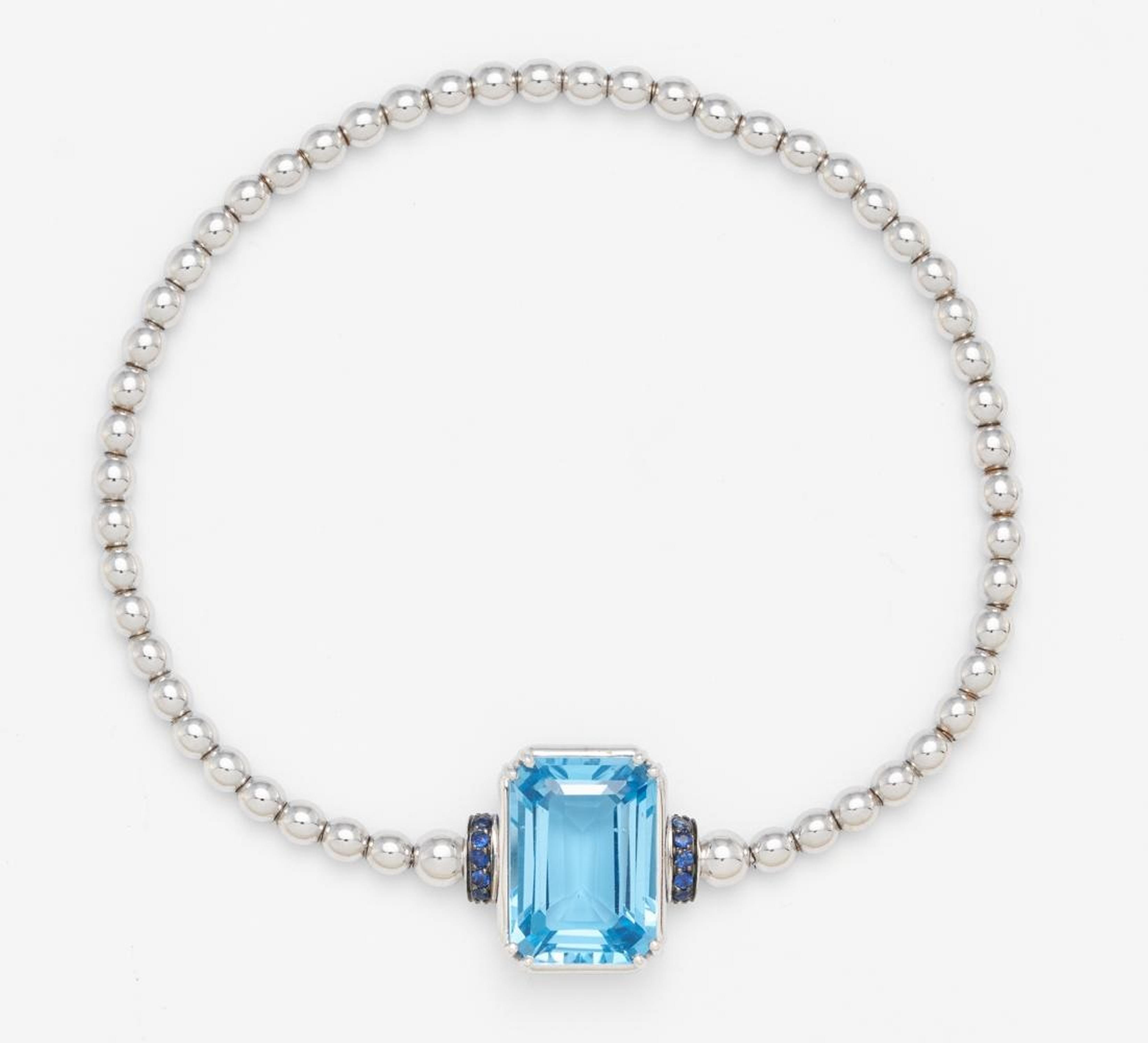Edelsteine: 1 blauer Topas im Emerald-Schliff ca. 8,7 ct., 10 kleine runde, facettierte Saphire zus. ca. 0,11 ct.