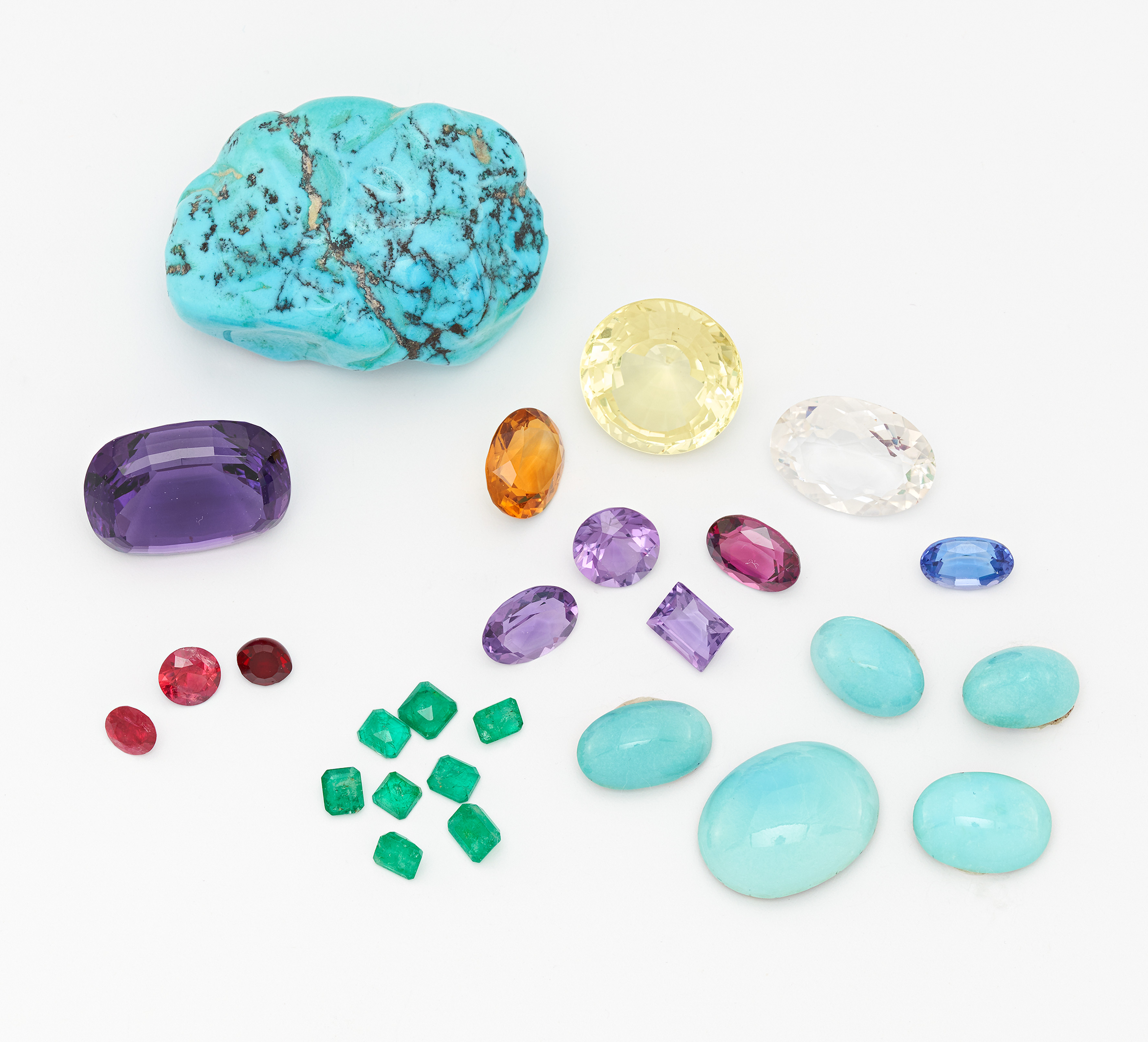 Beschreibung: 1 Amethyst 27,4 ct., Konvolut 7 Farbsteine (Bergkristall 8,3 ct., Citrin 4,2 ct., 3 Amethyste zus. 6,9 ct., Lemonquarz 17,9 ct., Rhodolit 3,6 ct.), 1 Partie rechteckiger Smaragde, 8 Stück, zus. ca. 3,9 ct., 1 Partie Türkise, 5 Stück, zus. ca. 35,5 ct., 1 Türkis-Barock ca. 163,0 ct., 1 Tansanit ca. 7,3 ct.