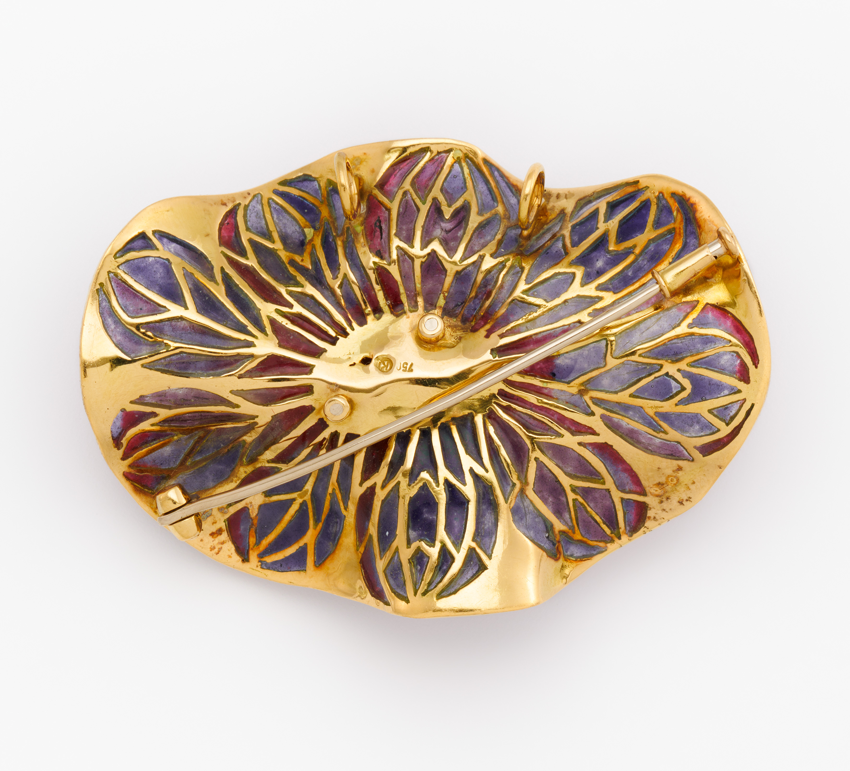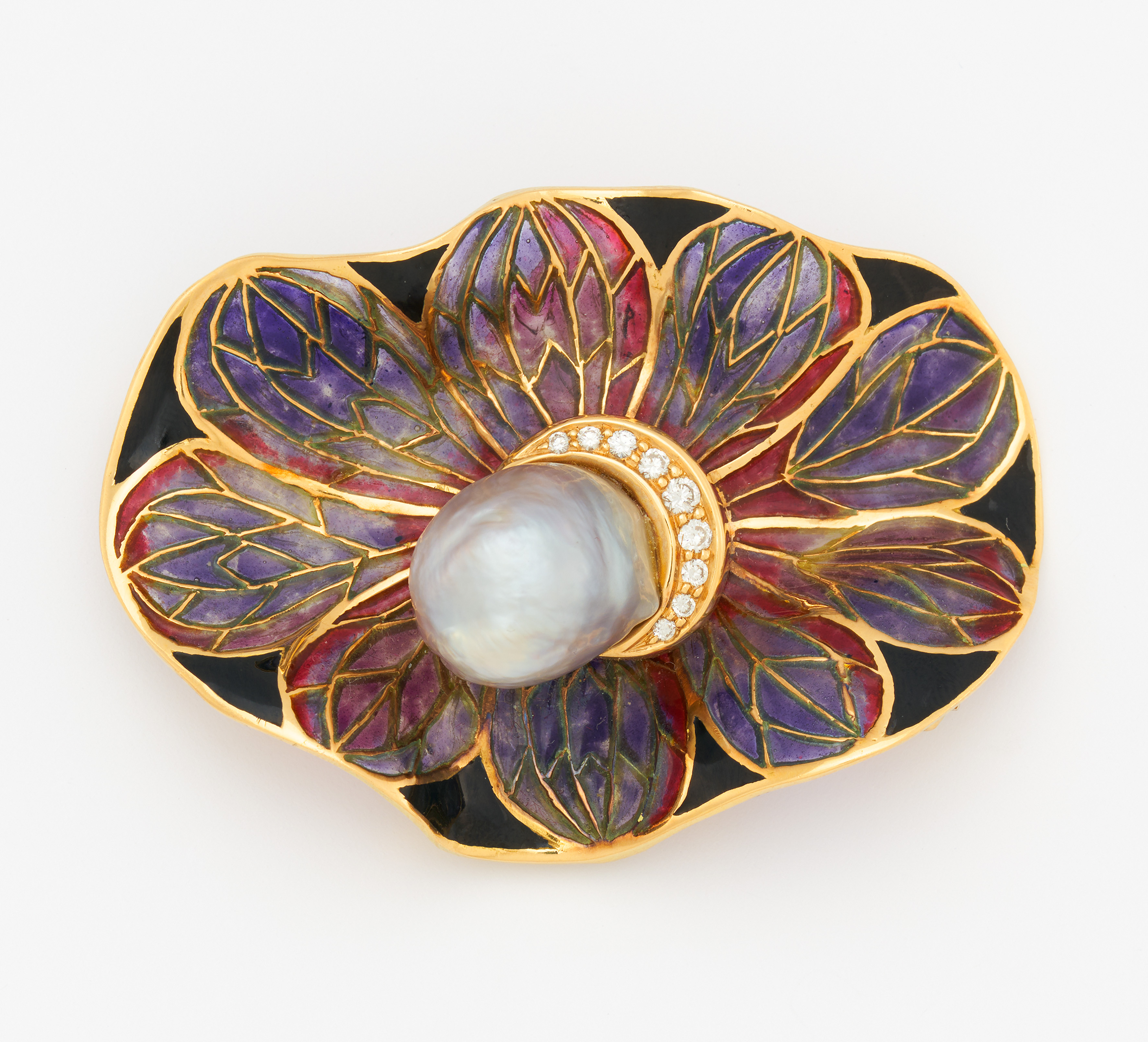 Material: 750/- Gelbgold, mehrfarbiges Fensteremail.
