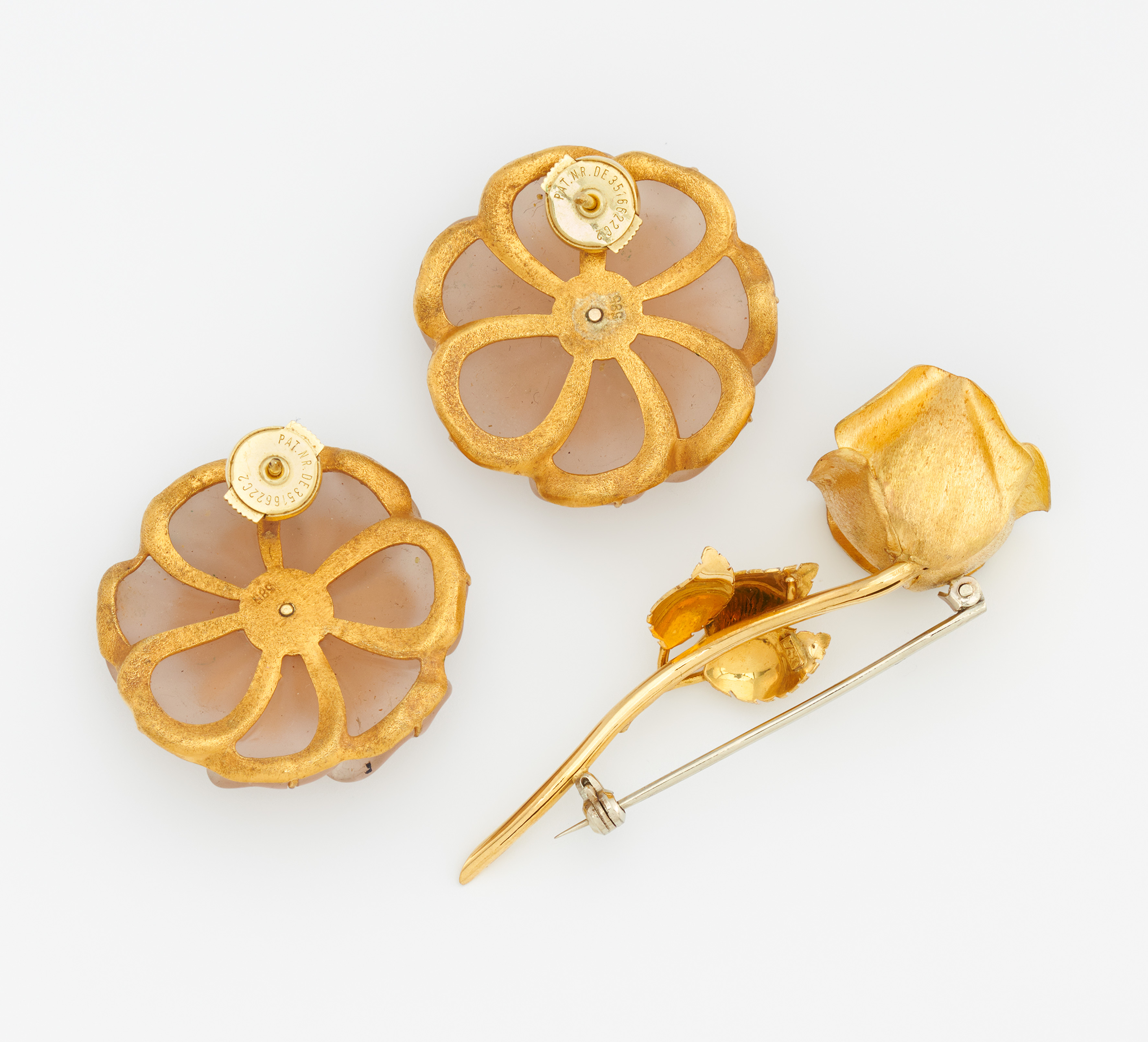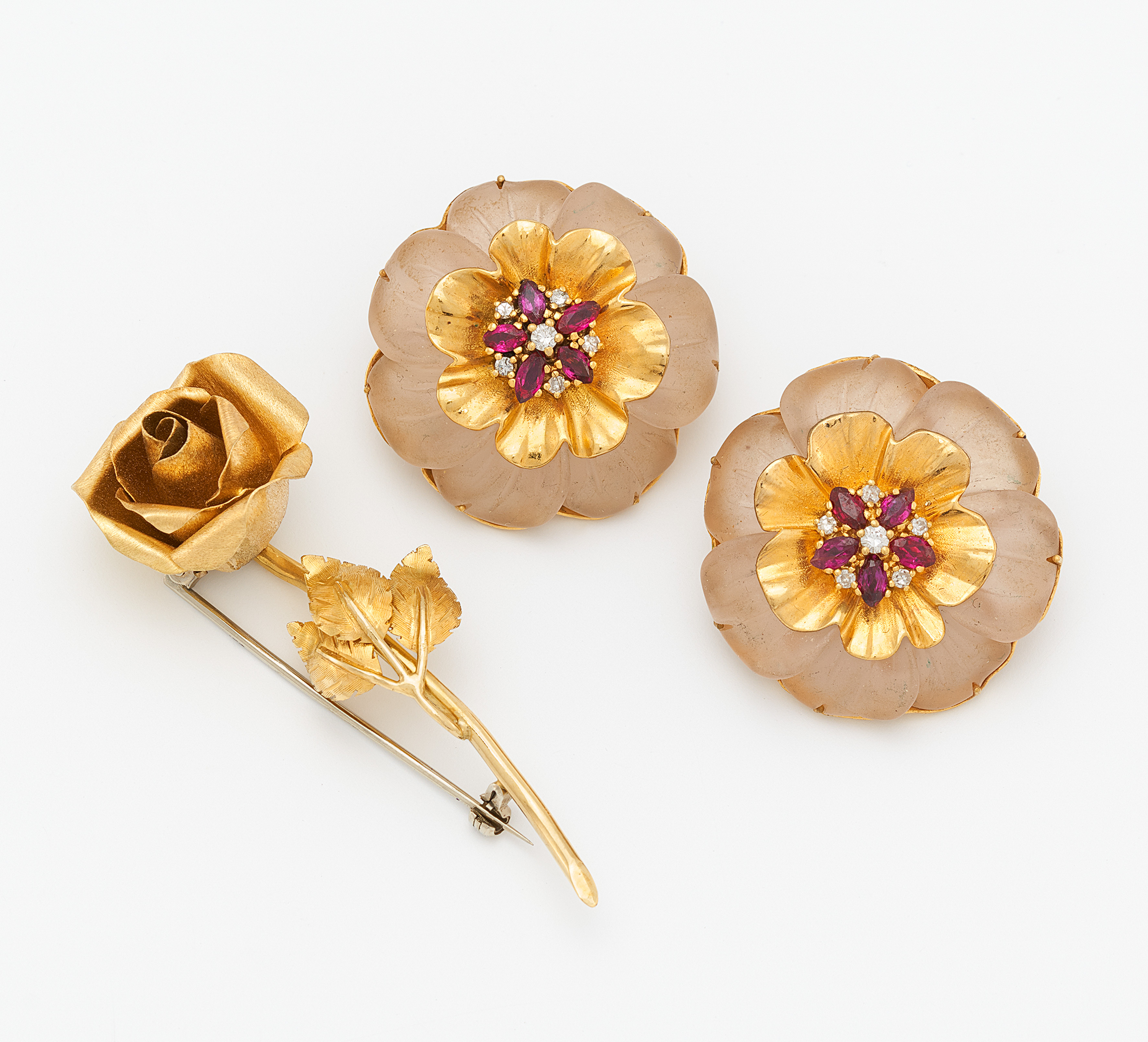 Beschreibung: Ohrstecker in Form von Blüten, Brosche in Form einer Rose.