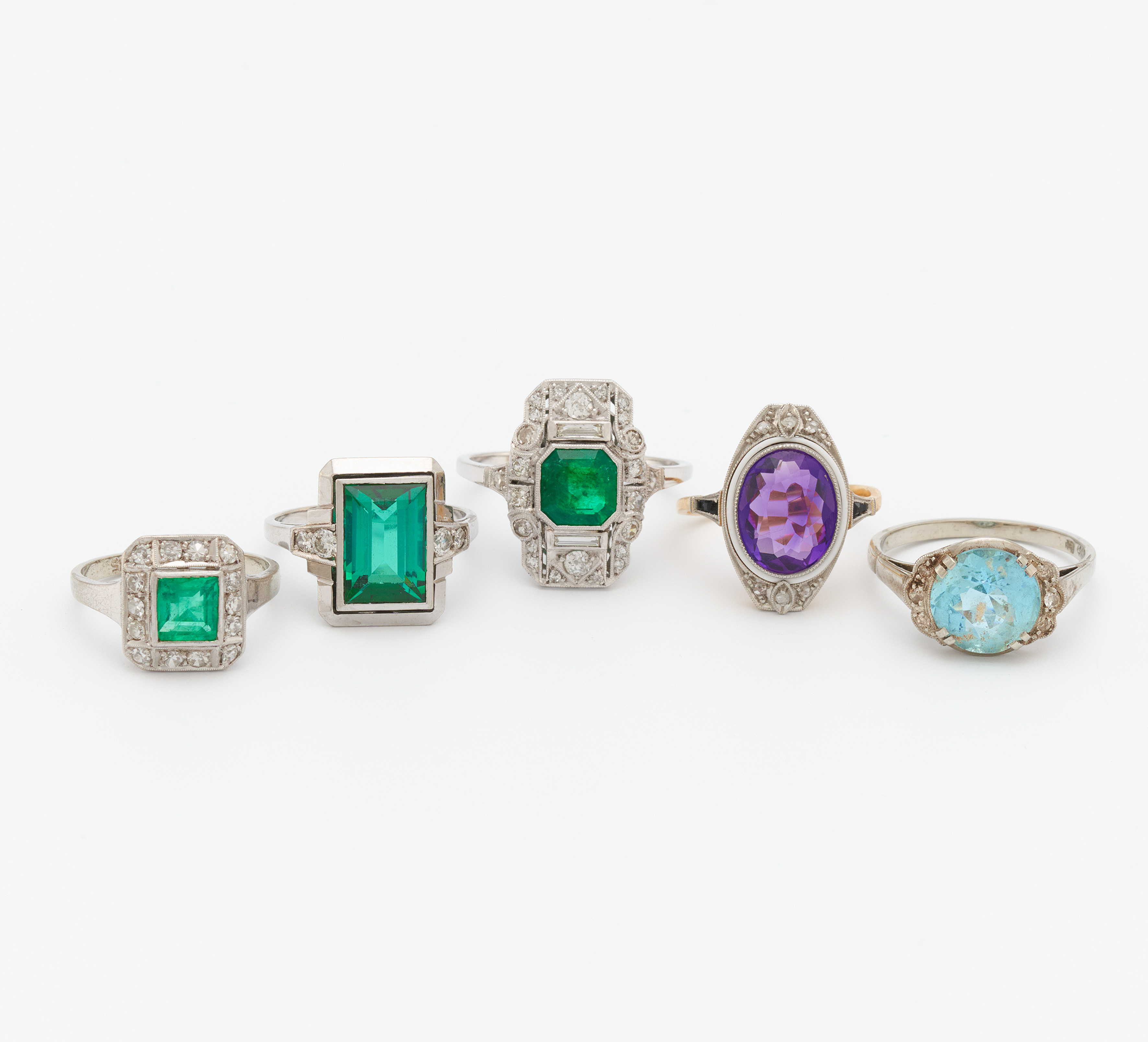 Edelsteine: 5 Farbsteine in verschiedenen Schliffausführungen, wohl Amethyst, Turmalin, Topas und Smaragd.