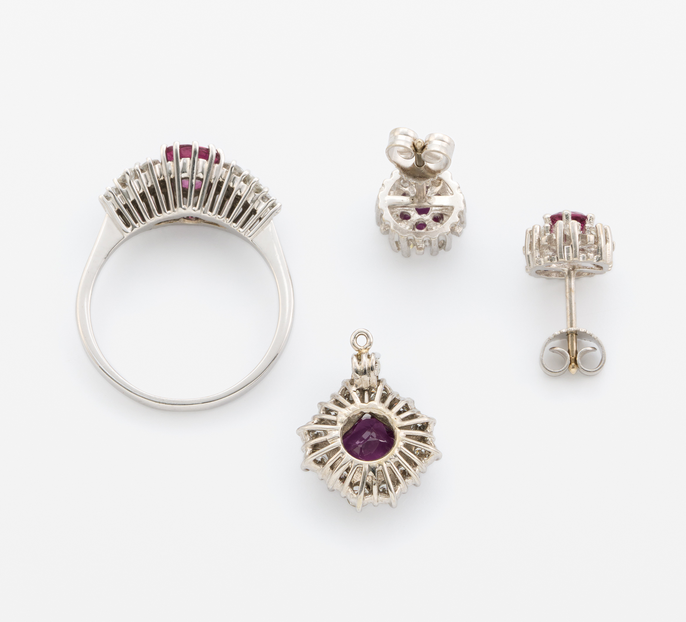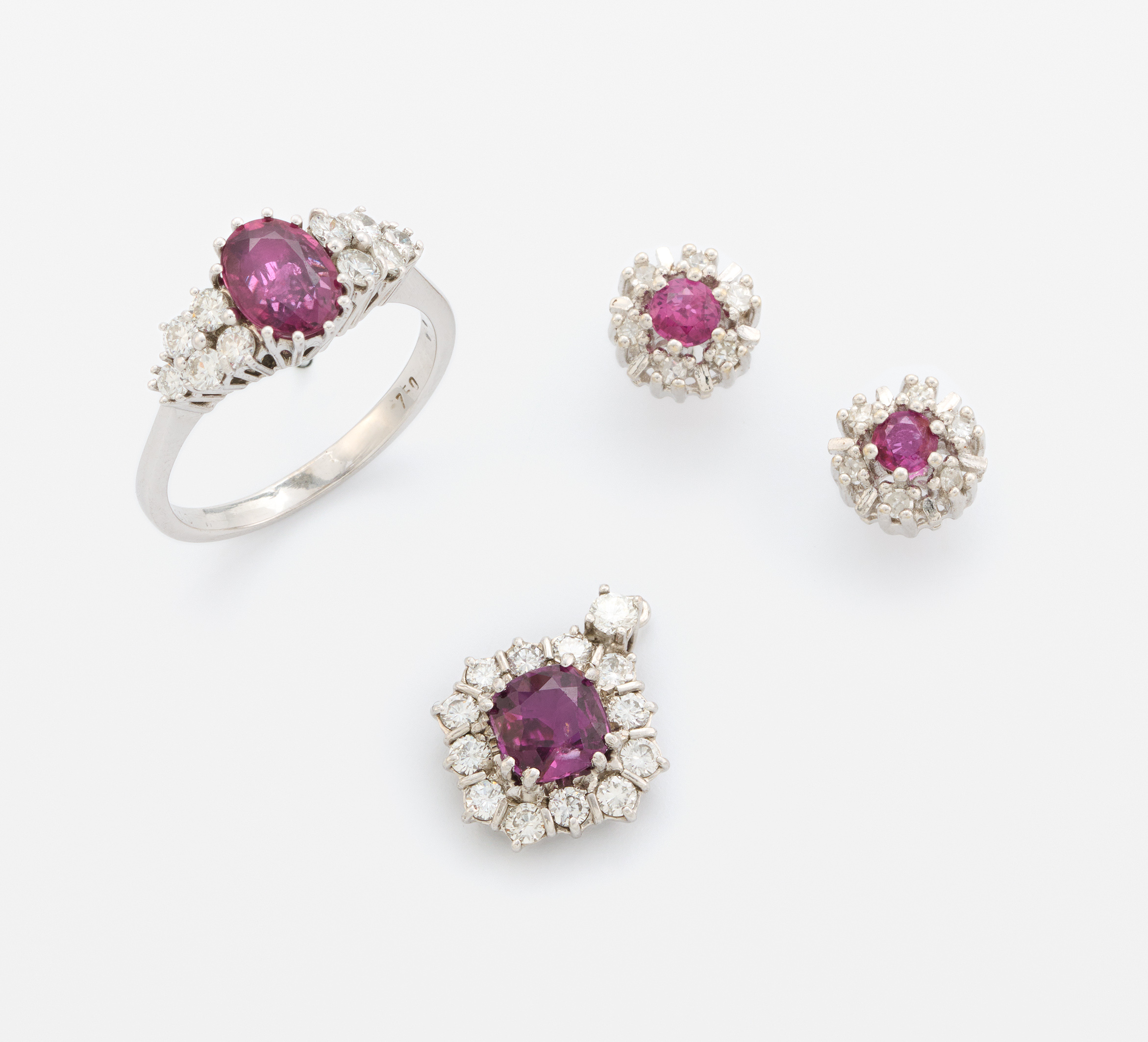 FARBSTEIN-DIAMANT-SET: RING, OHRSTECKER UND ANHÄNGER.