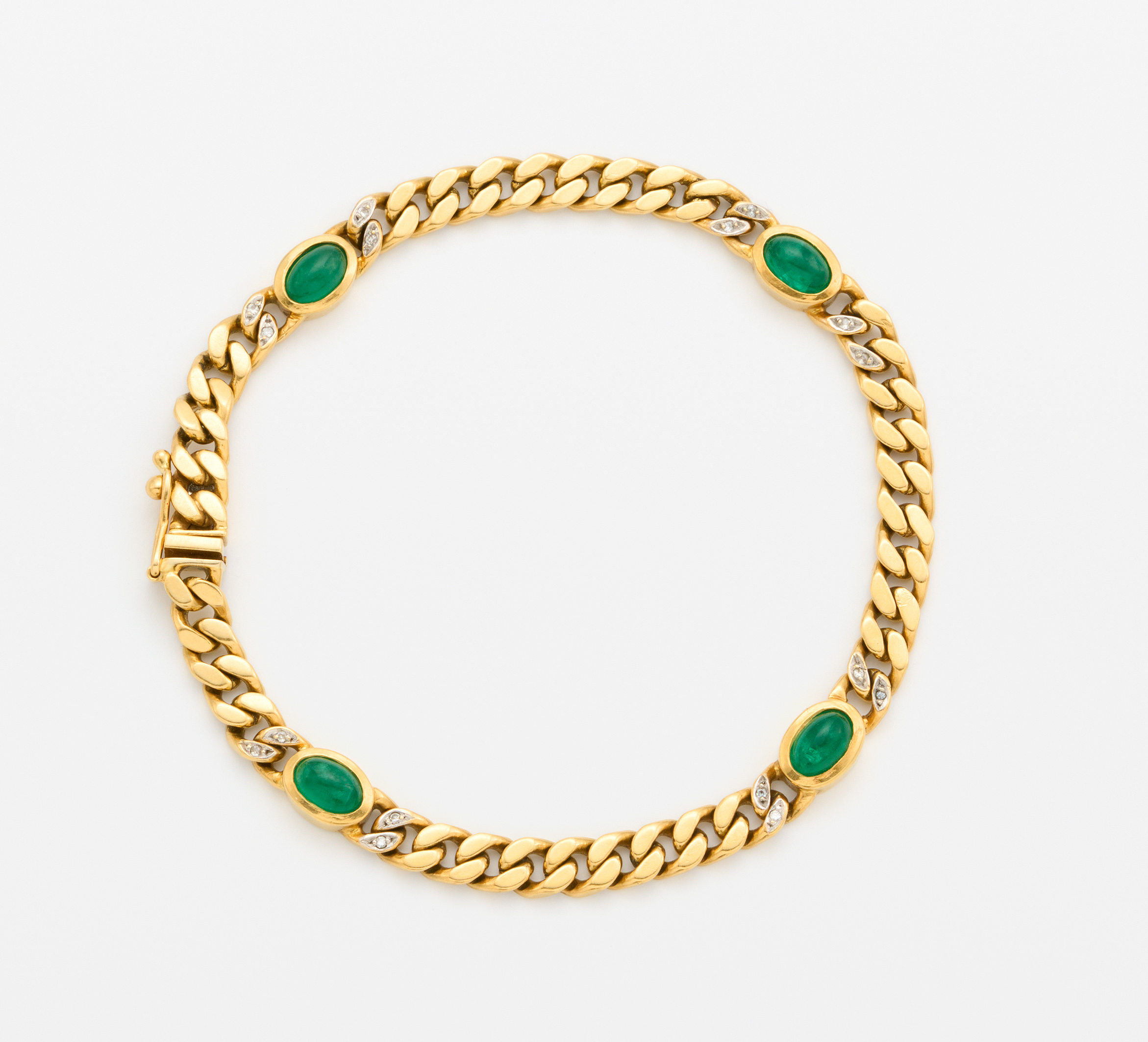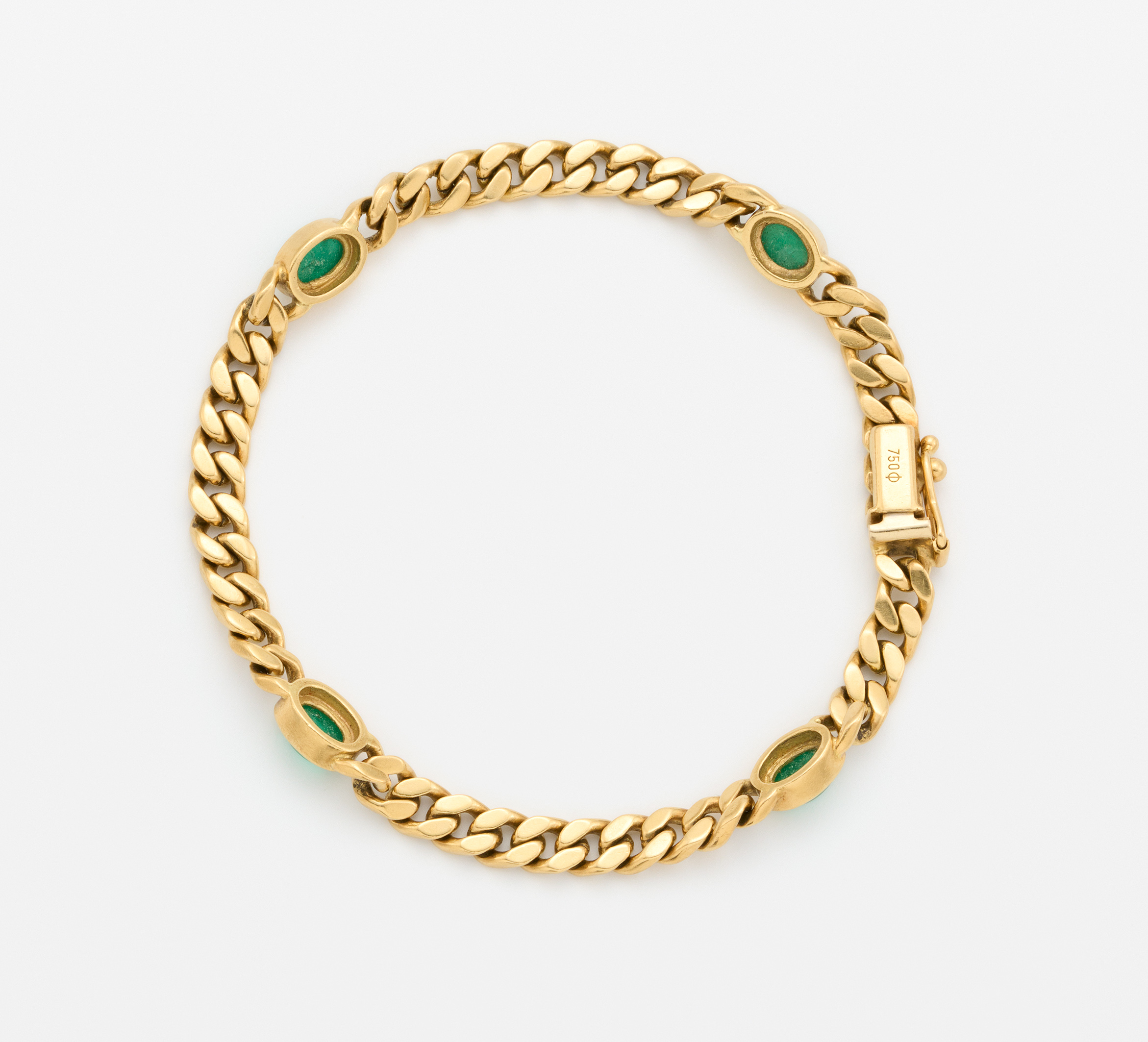 Edelsteine: 4 grüne, ovale Farbsteine im Cabochon-Schliff, wohl Smaragde zus. ca. 1,6 ct.