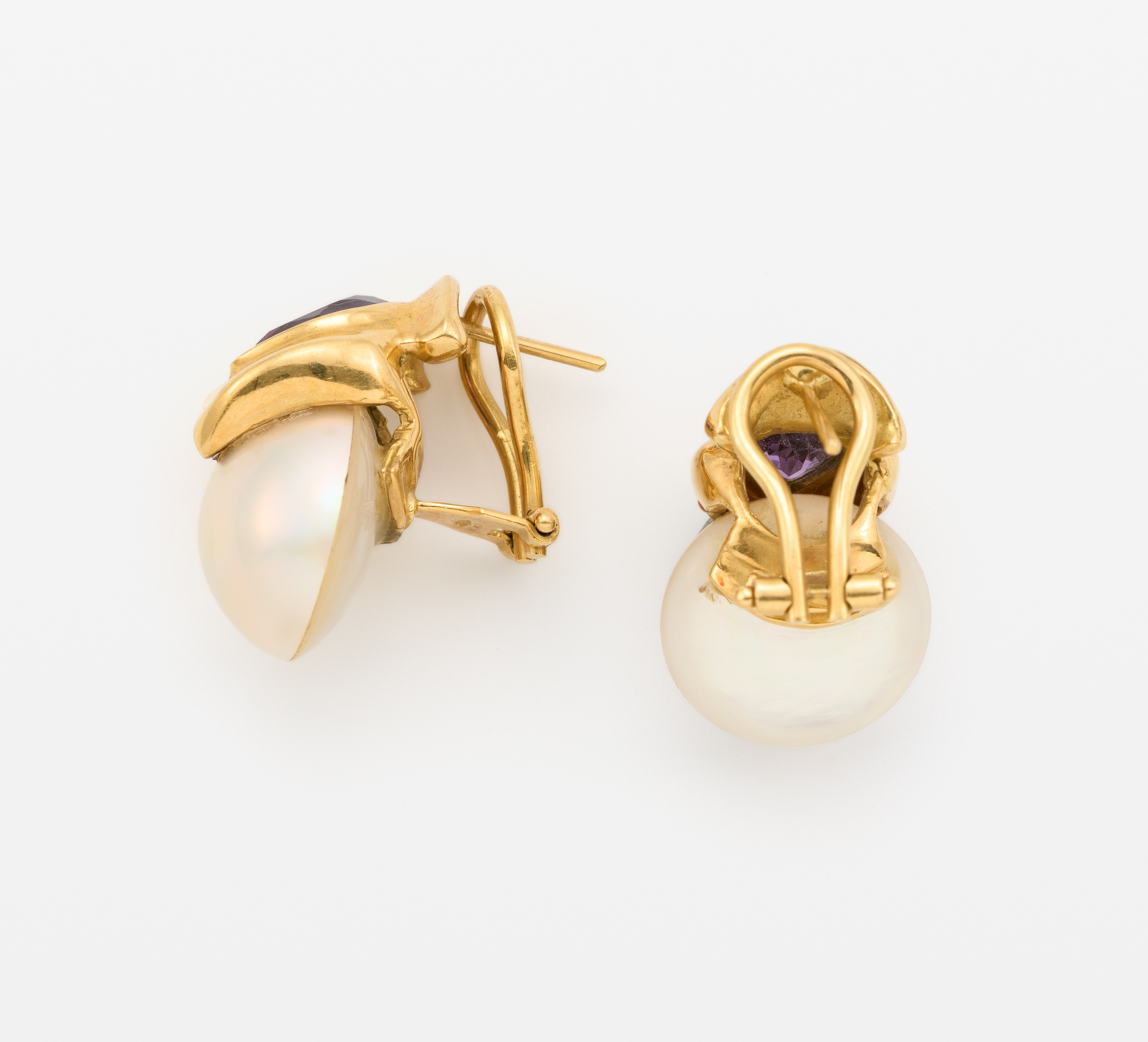 Org. Substanzen: 2 halbe boutonförmige Marbé-Perlen, weiß, Rückseitig Perlmutt, Ø ca. 15,3 mm.