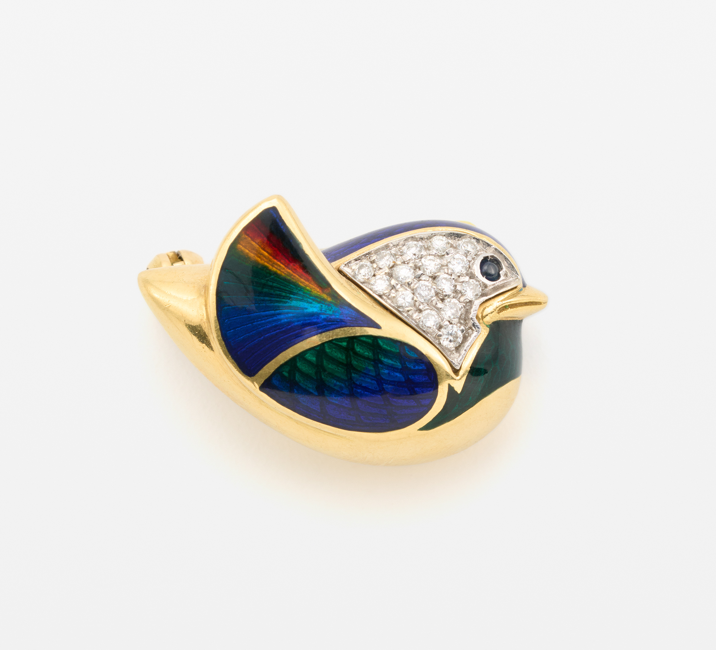 Material: 750/- Weiß- und Gelbgold, Punze, polychromes transluzides Email.