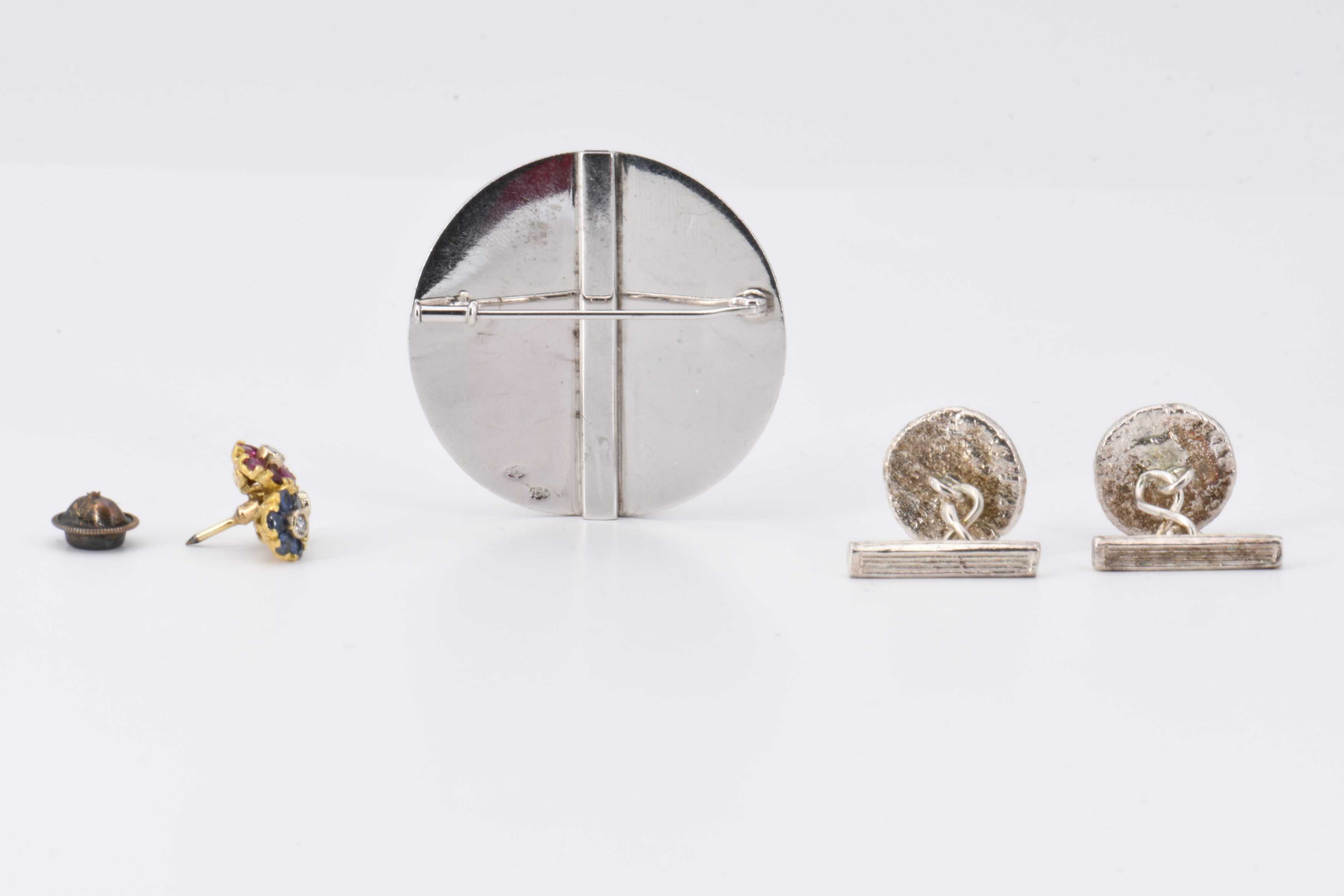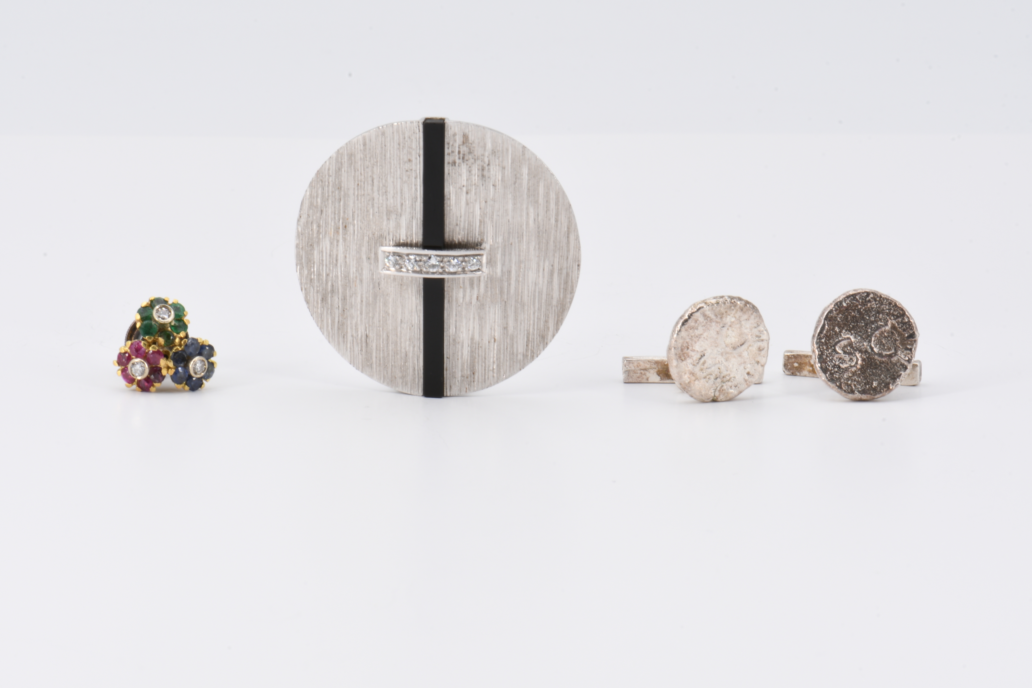 Beschreibung: Beilage: 1 Paar Manschettenknöpfe, Silber. 1 kleine Farbstein-Diamant-Brosche.