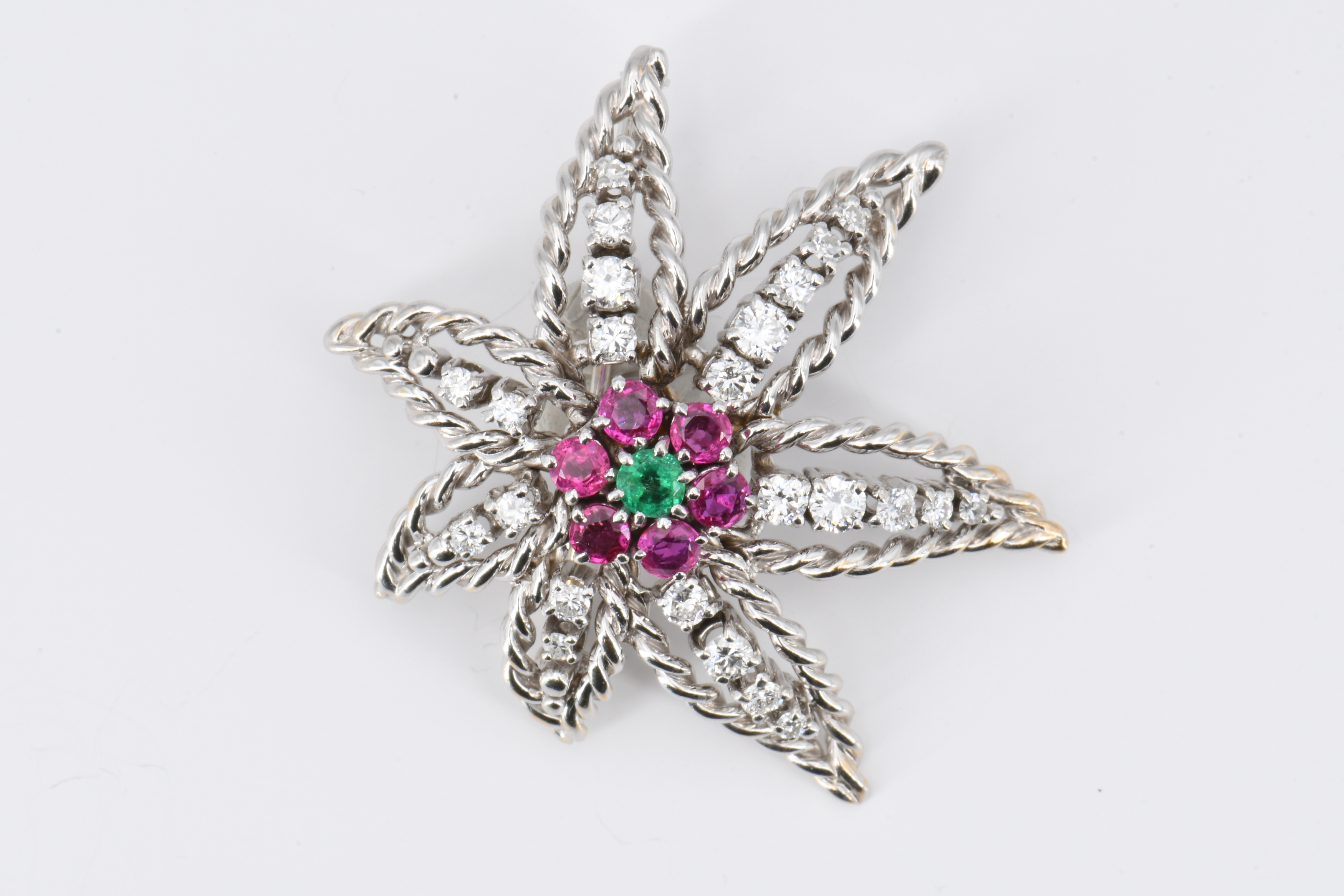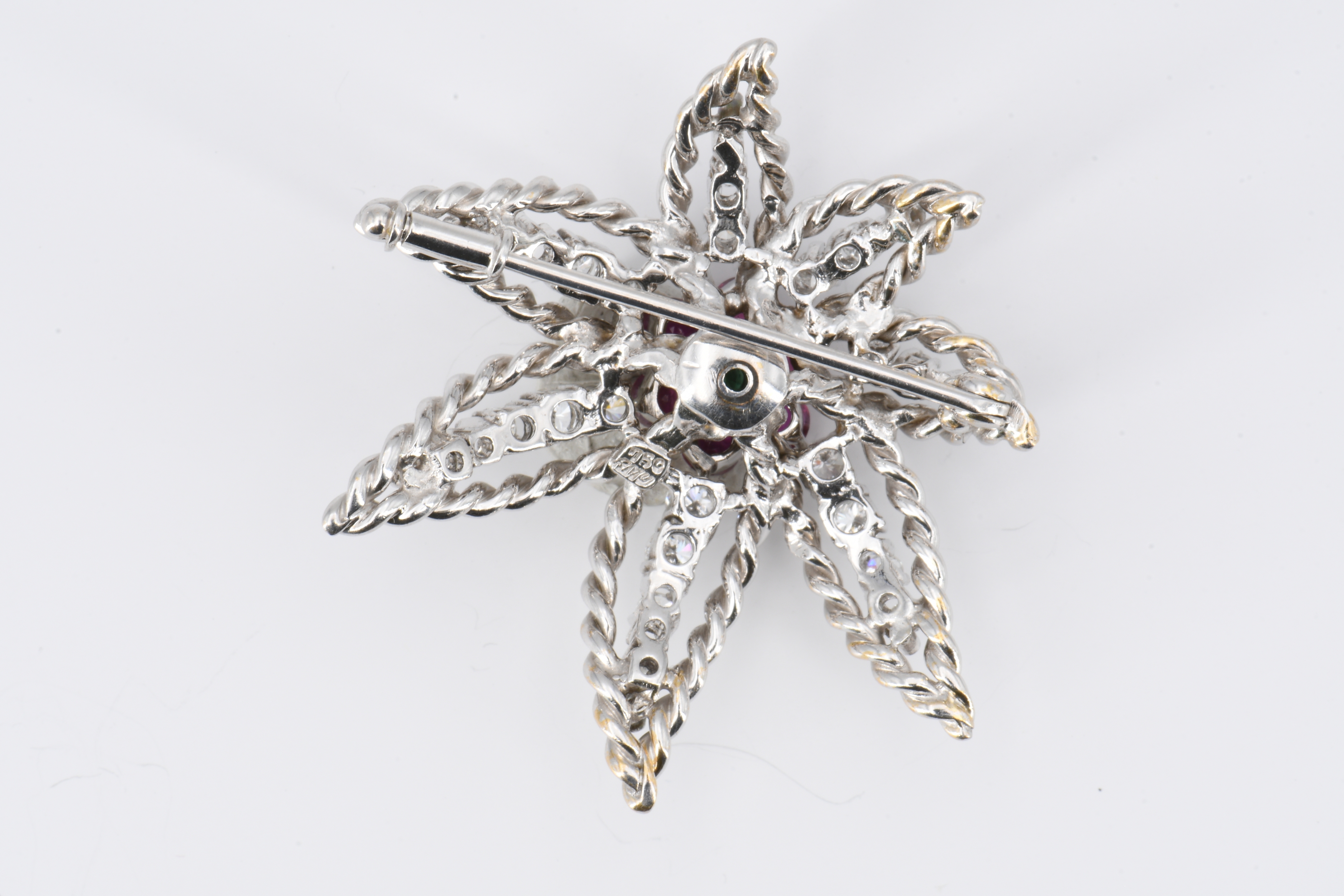 Edelsteine: 6 rote, runde, facettierte Farbsteine, wohl Rubine, Ø ca. 3,4 mm, 1 runder, facettierter, grüner Farbstein, wohl Smaragd, Ø ca. 4,0 mm.