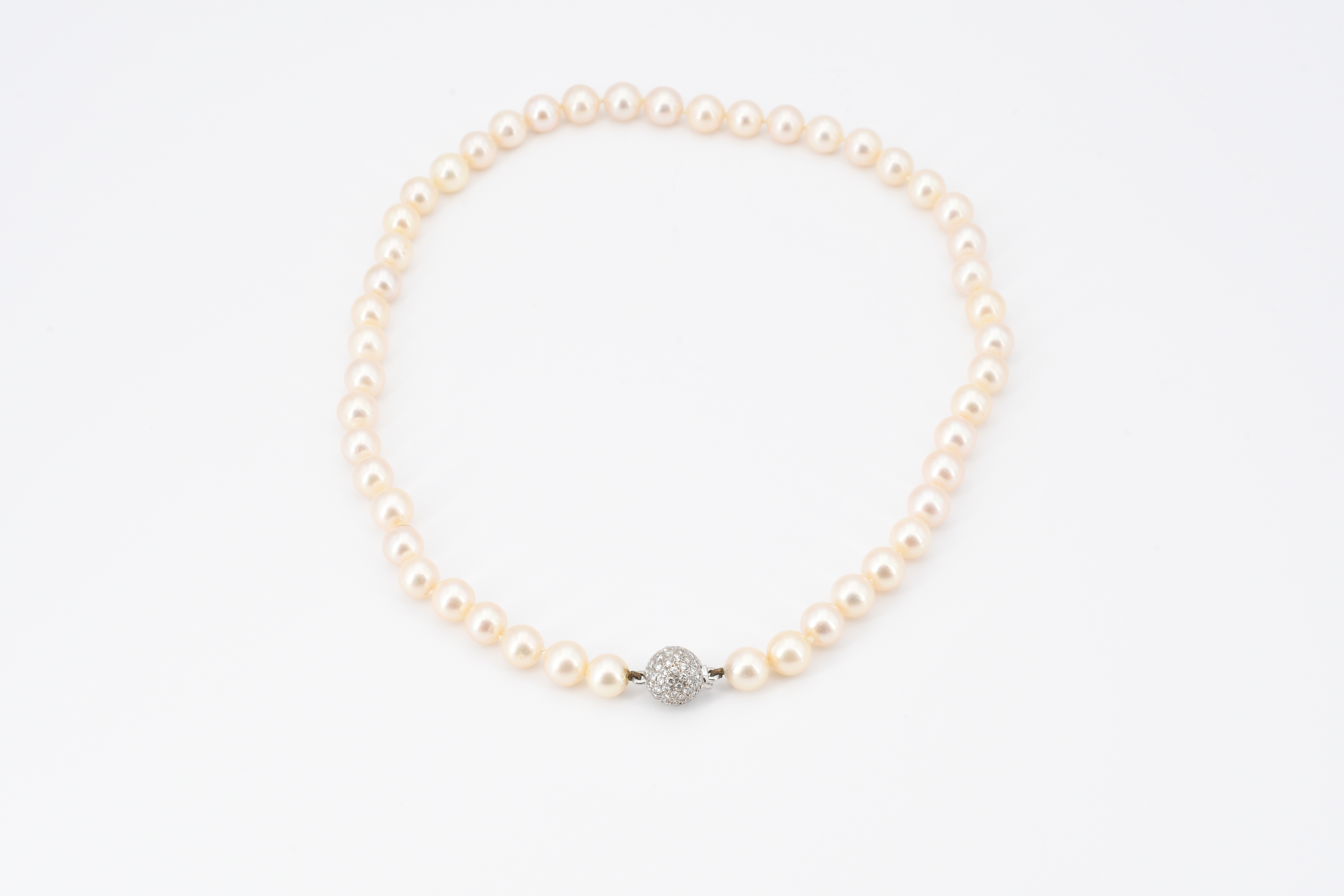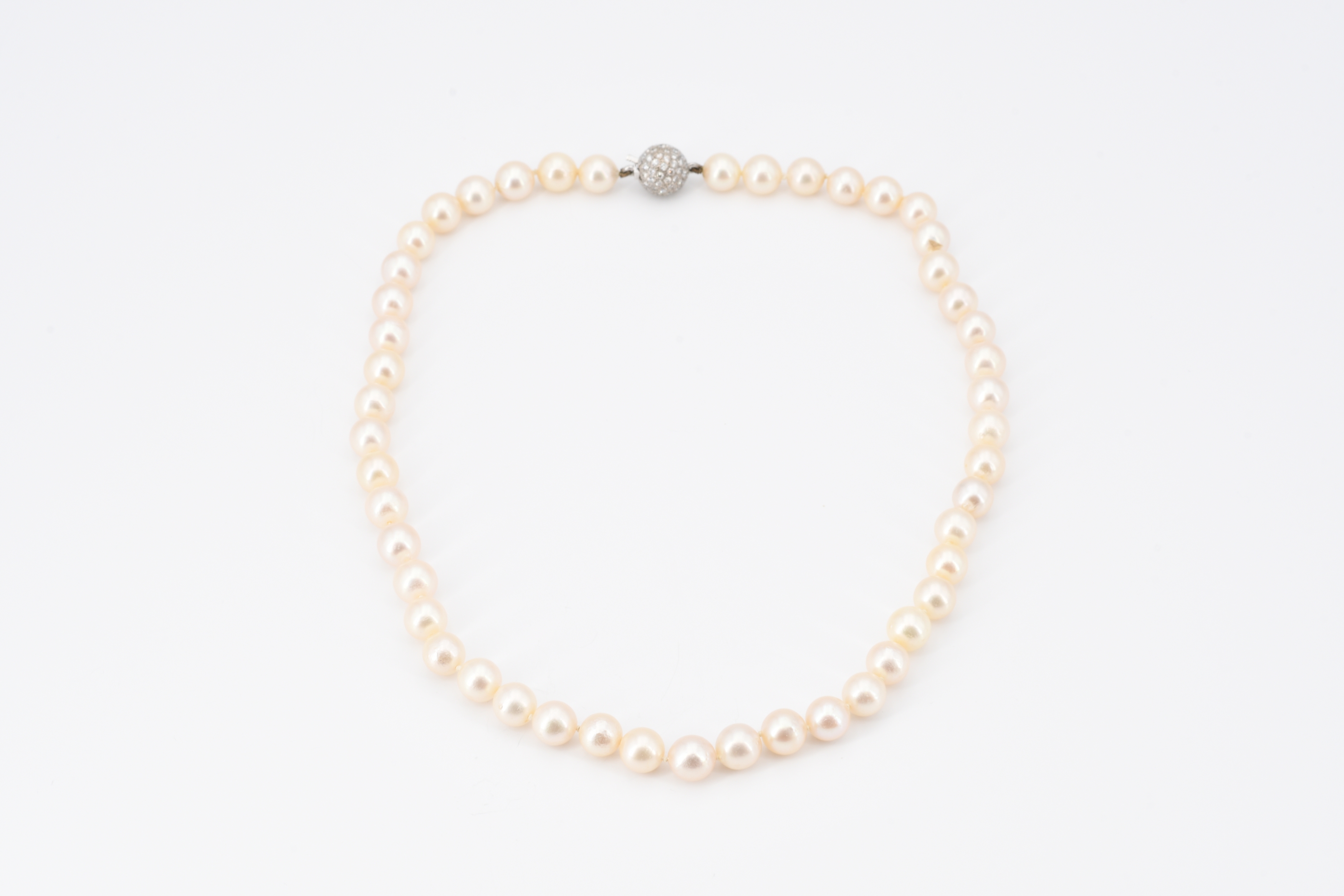 Org. Substanzen: 49 Akoya-Zuchtperlen Ø ca. 7,3-7,6 mm, weiß-cremefarben.