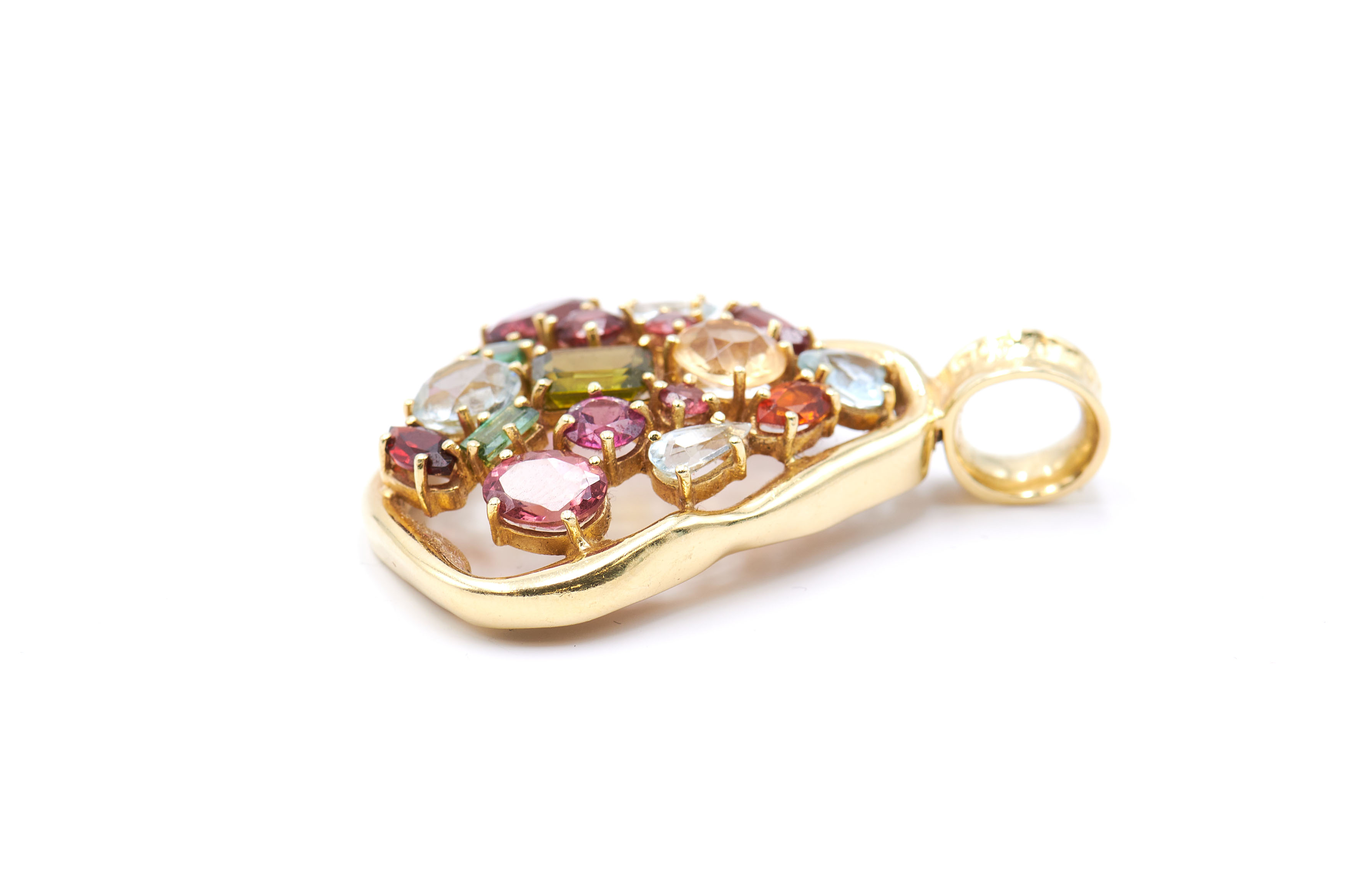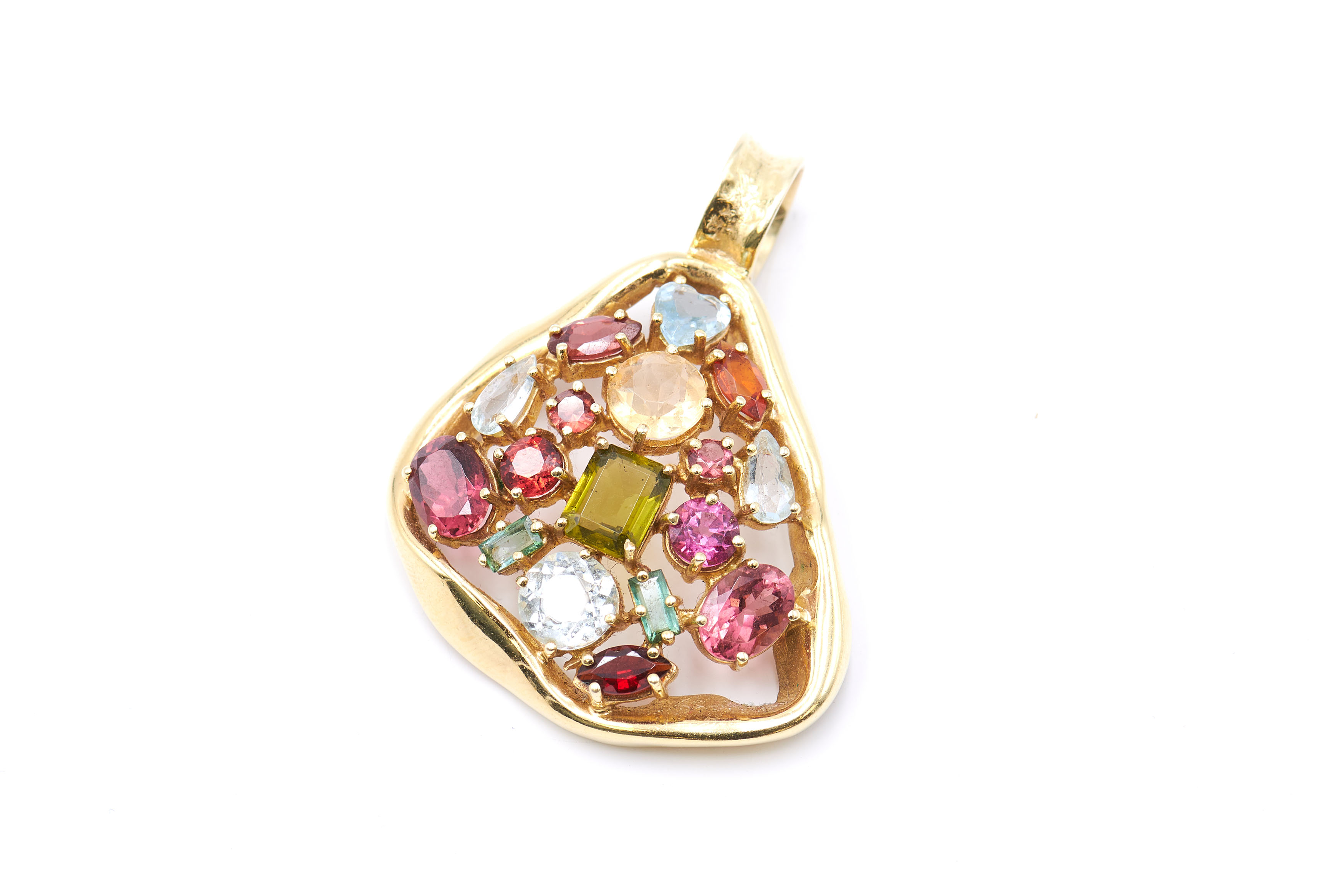 Edelsteine: 17 unterschiedliche Farbsteine im Brillant-, Baguette-, Emerald-, Oval-, Navette-, Tropfen- und Herz-Schliff, rosa, weiß, hellblau, hellgrün, orange, rot, hellgelb, Ø ca. 2,8 - 6,2 mm.