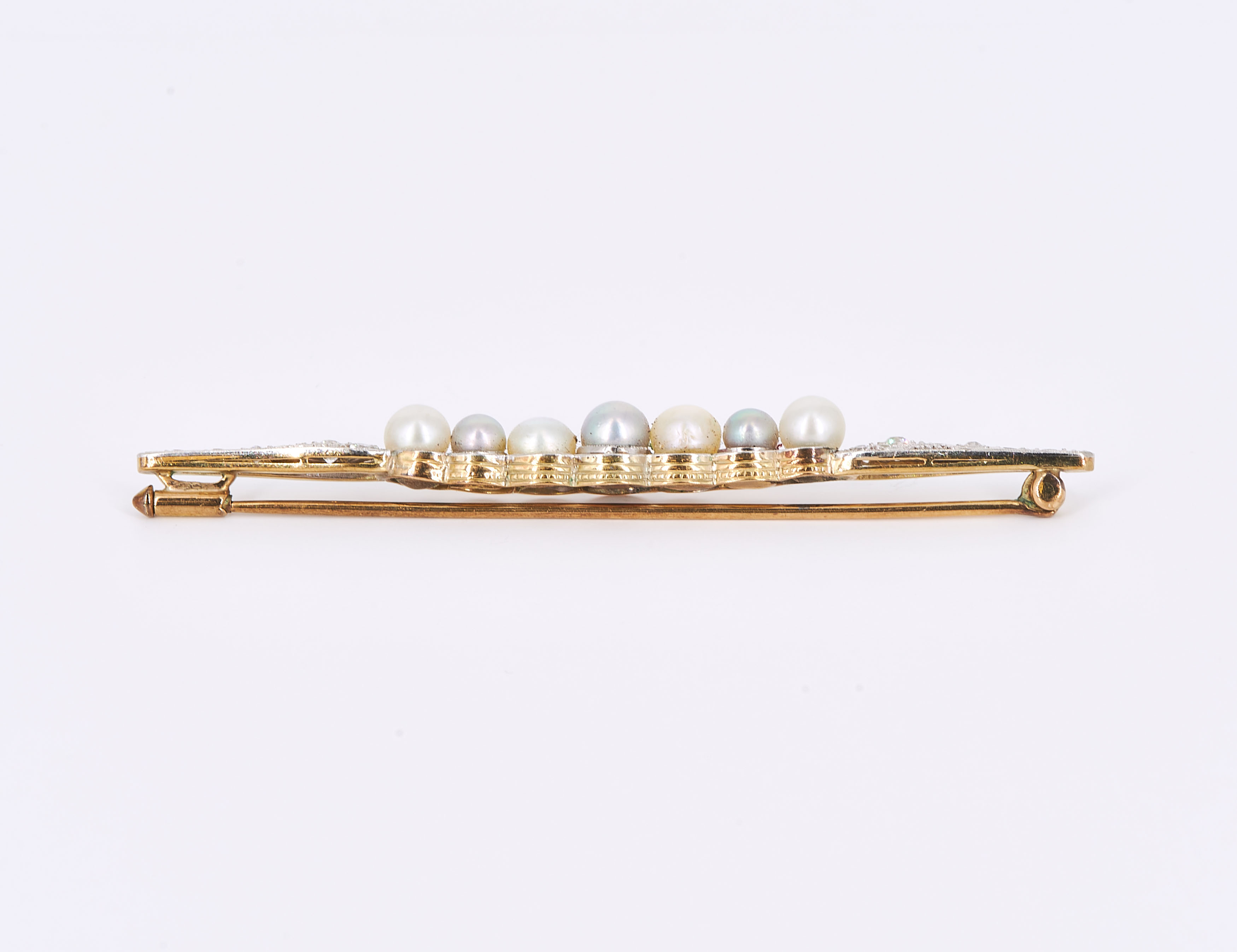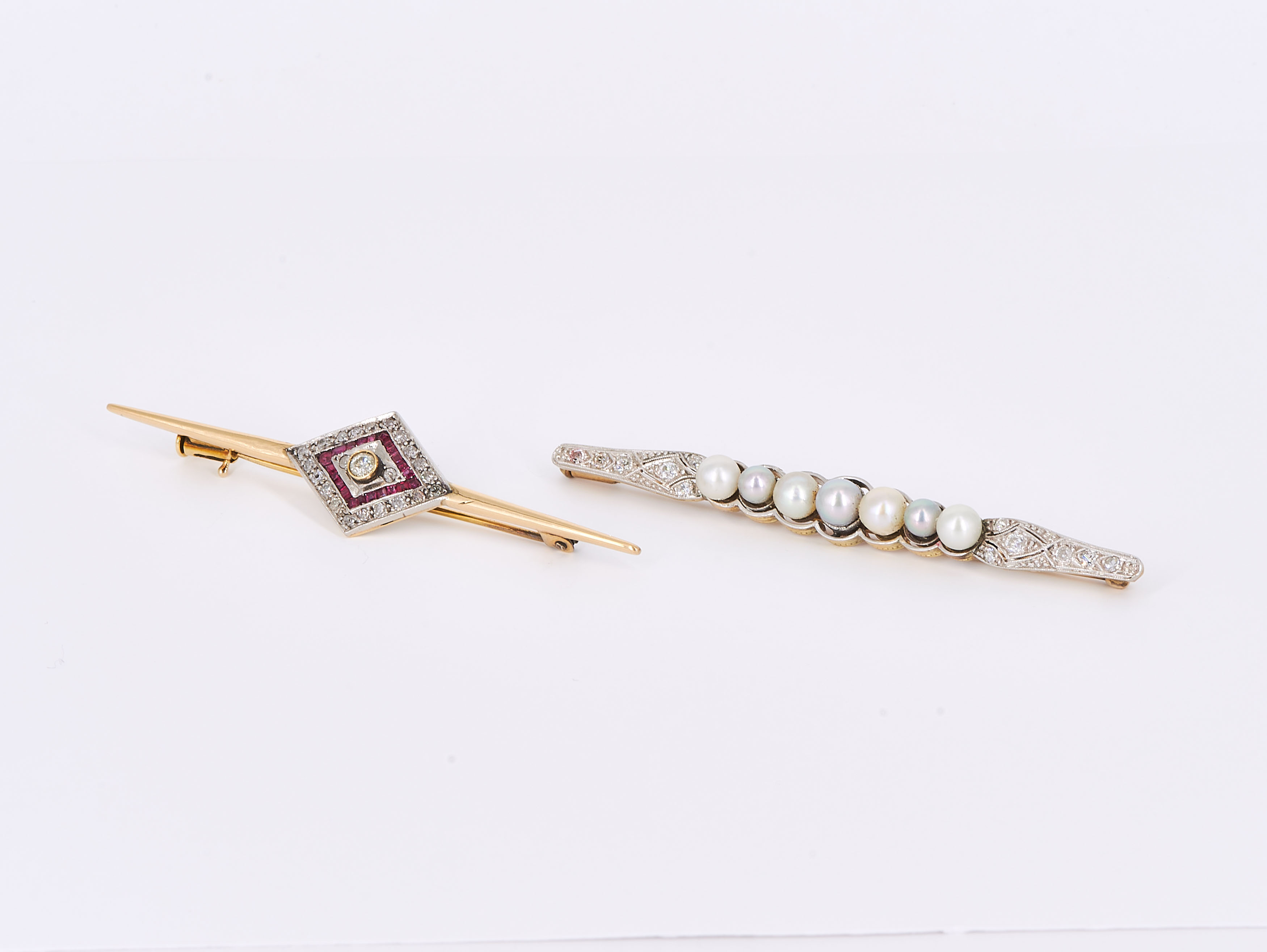 SET: PERL-DIAMANT-BROSCHE UND FARBSTEIN-DIAMANT-BROSCHE.