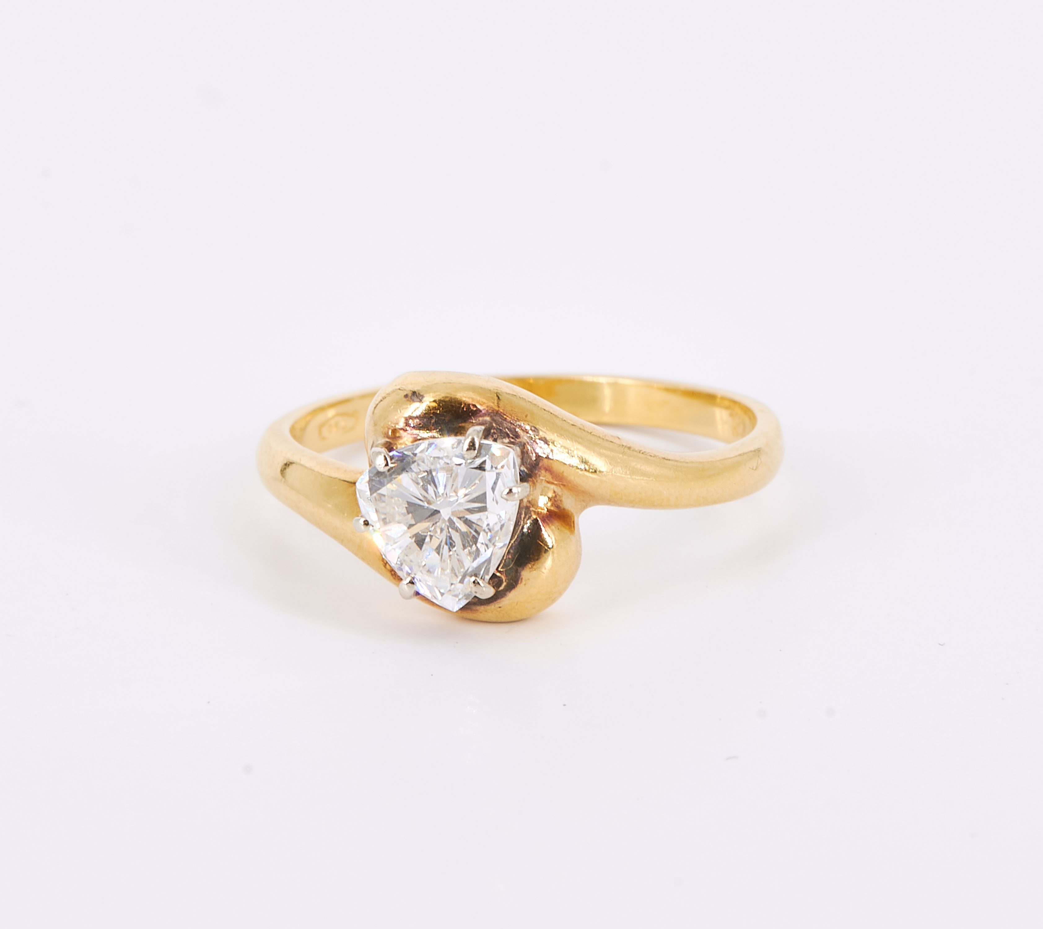 Diamanten: 1 Diamant im Trilliant-Schliff ca. 0,95 ct., H-I/SI, 1 Natural an der Rundiste.