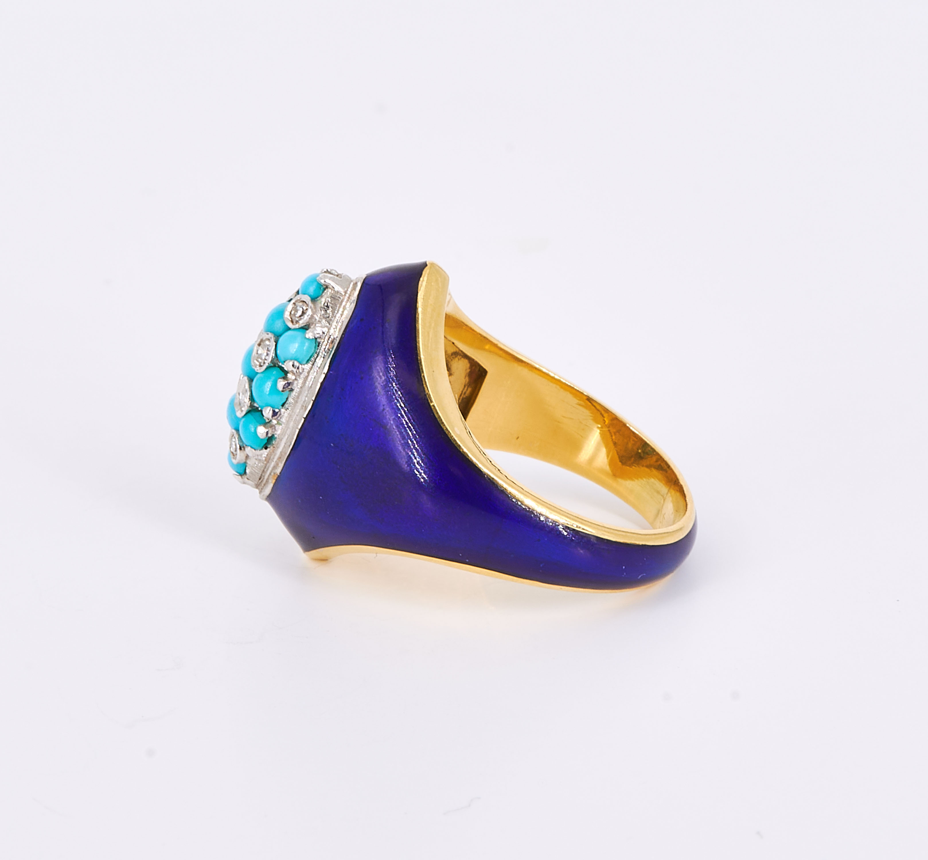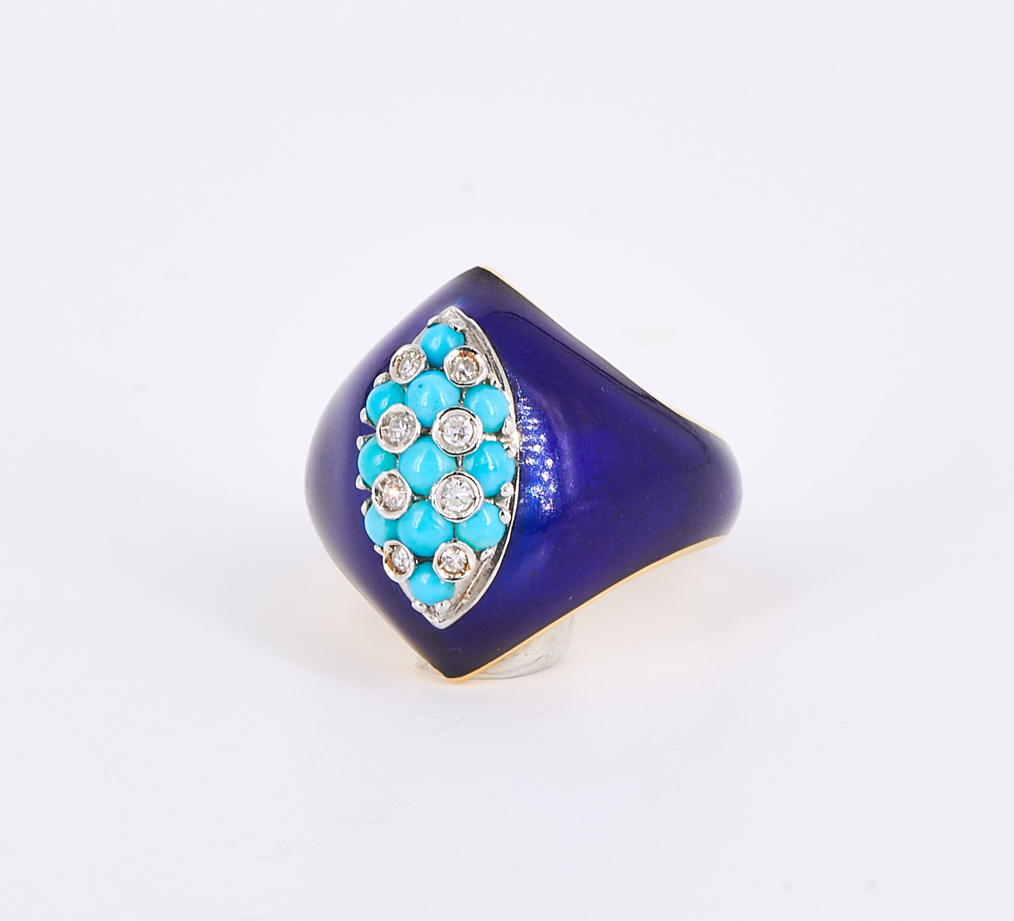 Material: 750/- Gelb- und Weißgold, Punze, dunkelblaues, transluzides Email.
