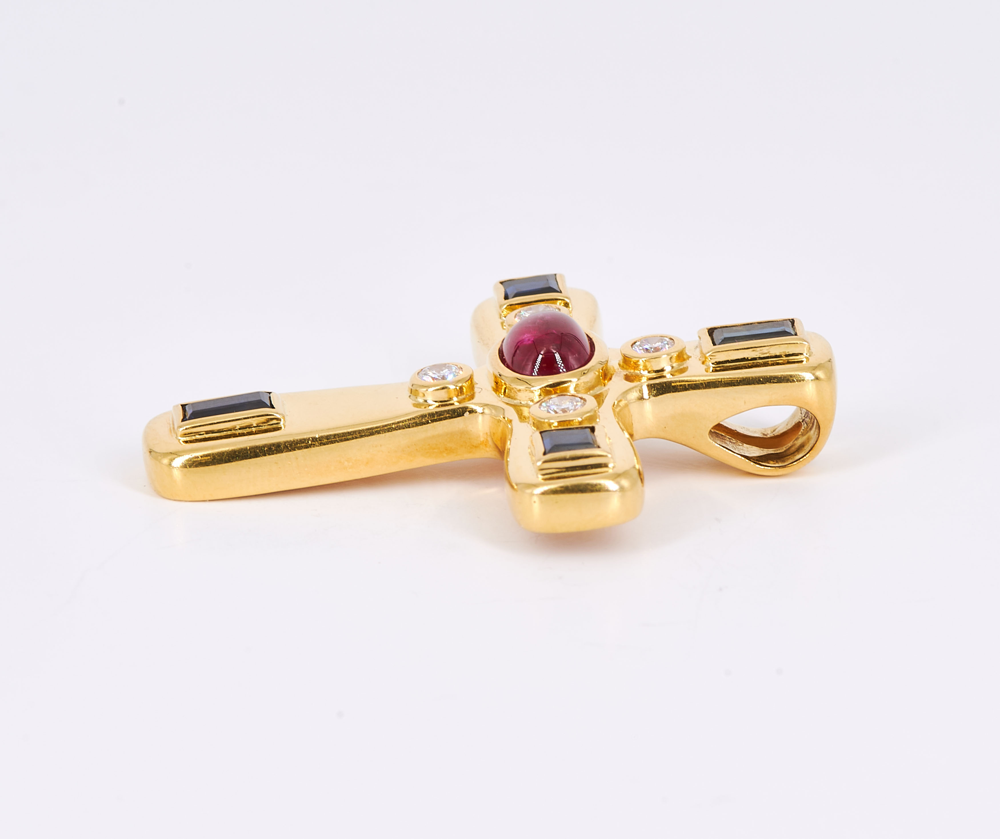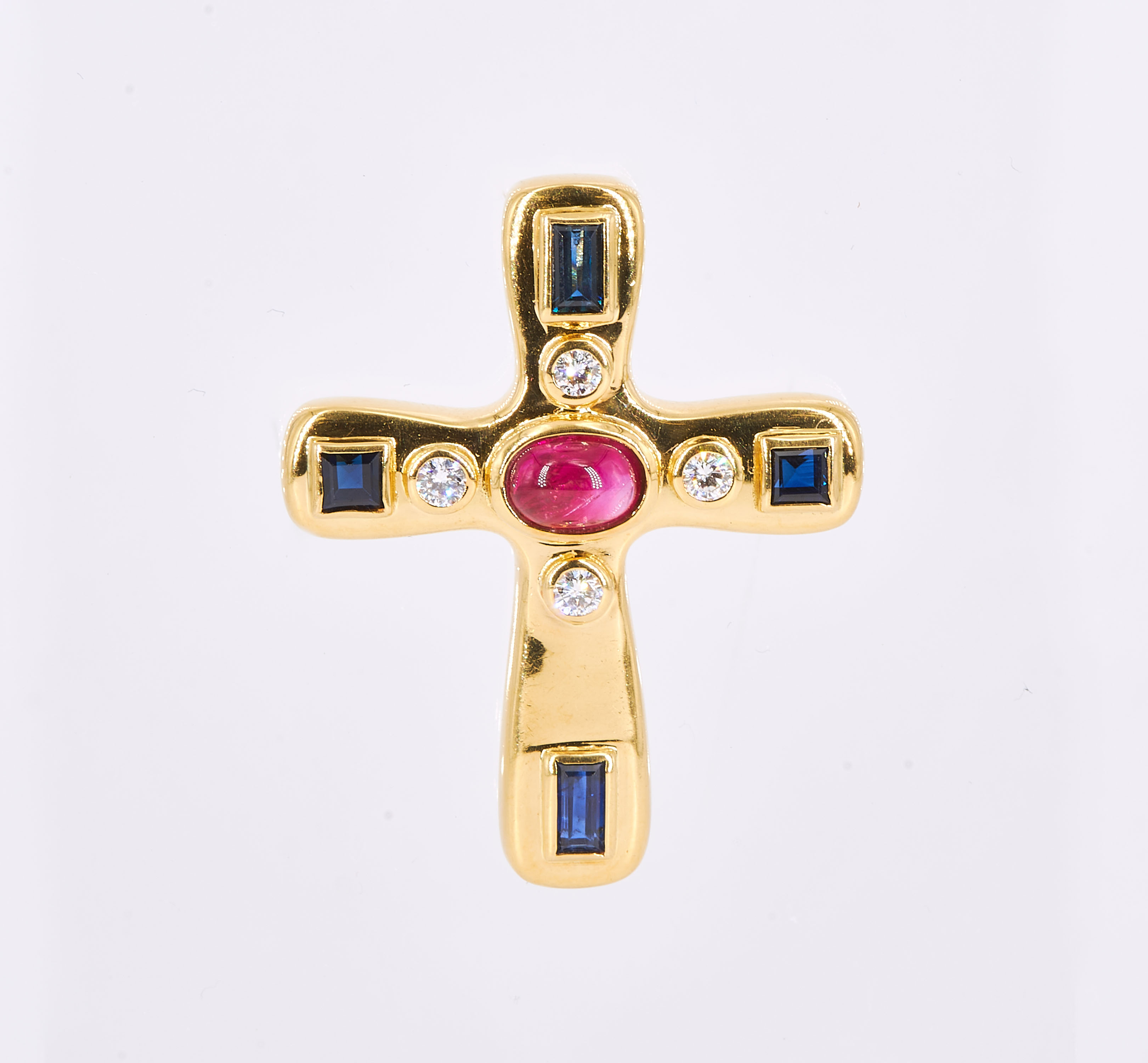 Edelsteine: 4 Farbsteine im Baguette- und Carré-Schliff, wohl Saphir, zus. ca. 0,92 ct., 1 Farbstein-Cabochon, wohl Rubin, ca. 1,45 ct.