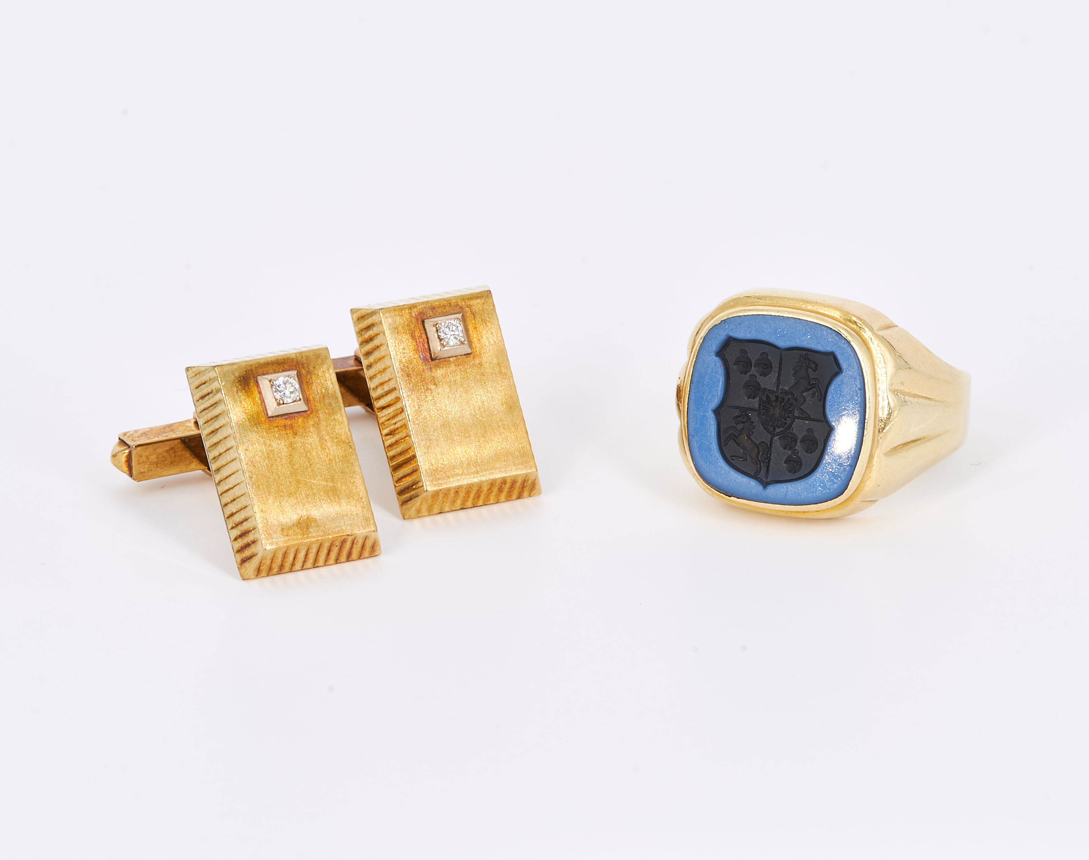 SET: SIEGEL-RING UND DIAMANT-MANSCHETTENKNÖPFEN.