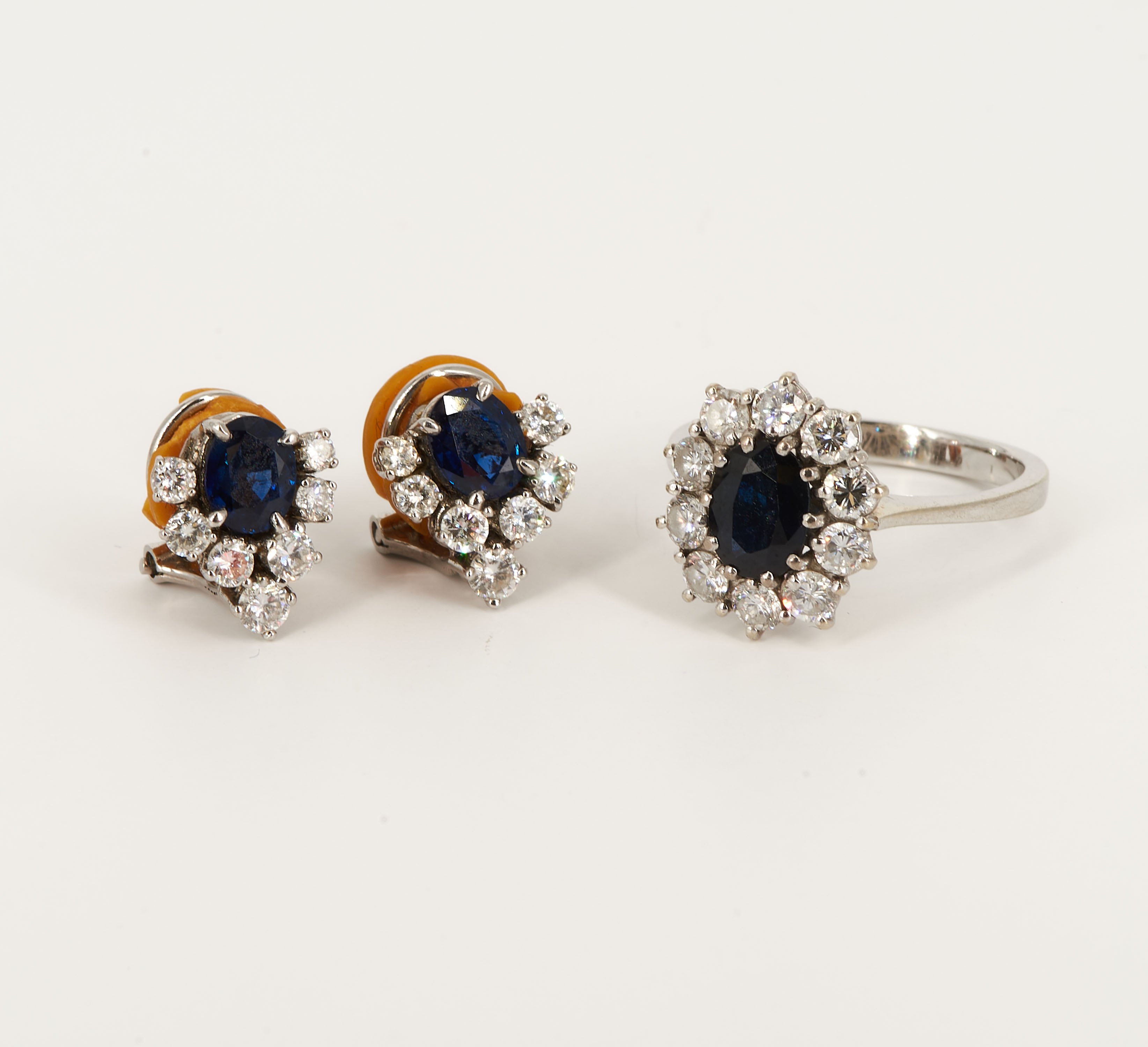 FARBSTEIN-DIAMANT-SET: RING UND OHRCLIPS.