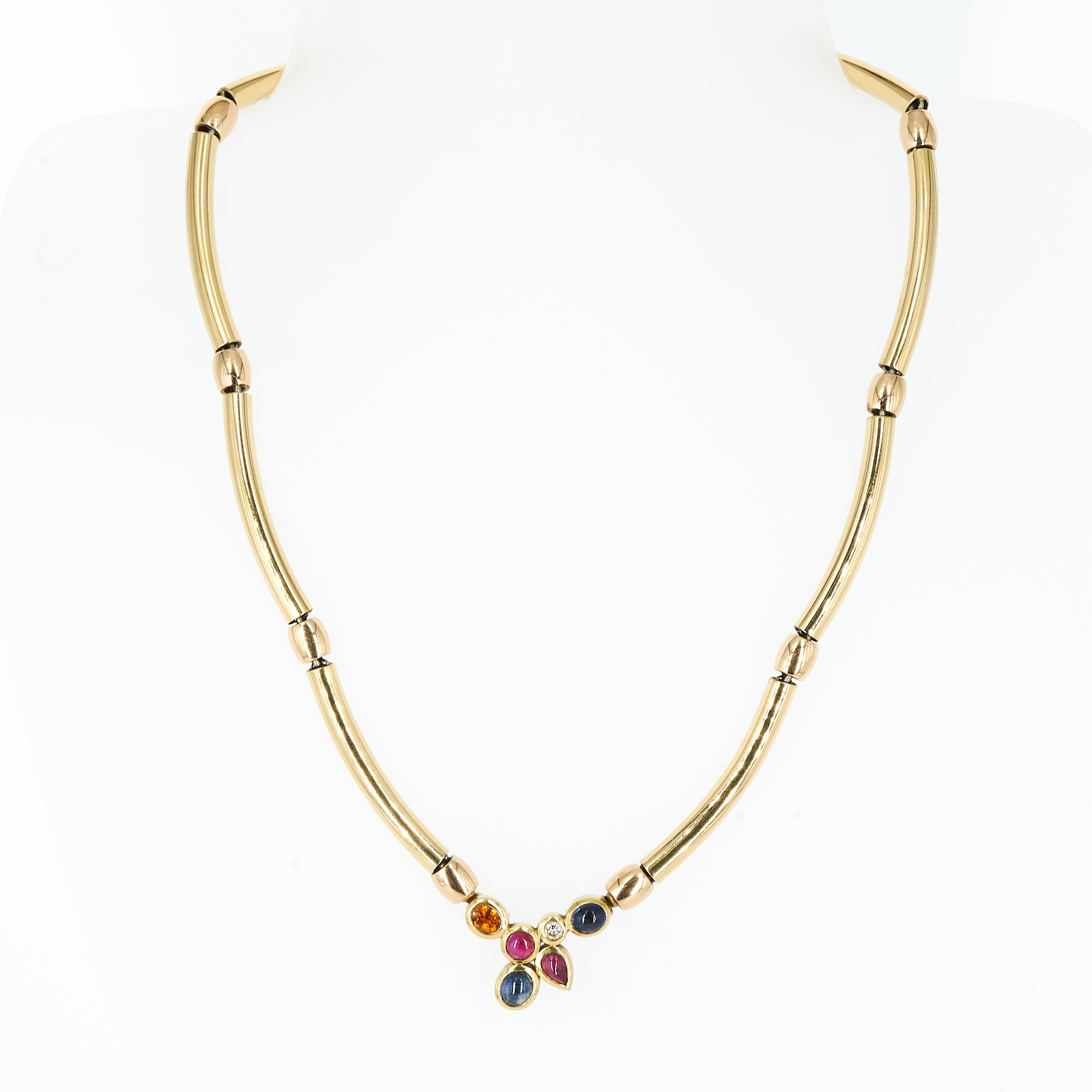 Beschreibung: Zwei auswechselbare Mittelstücke, eine Goldkugel und ein Farbstein-Diamant-Anhänger.