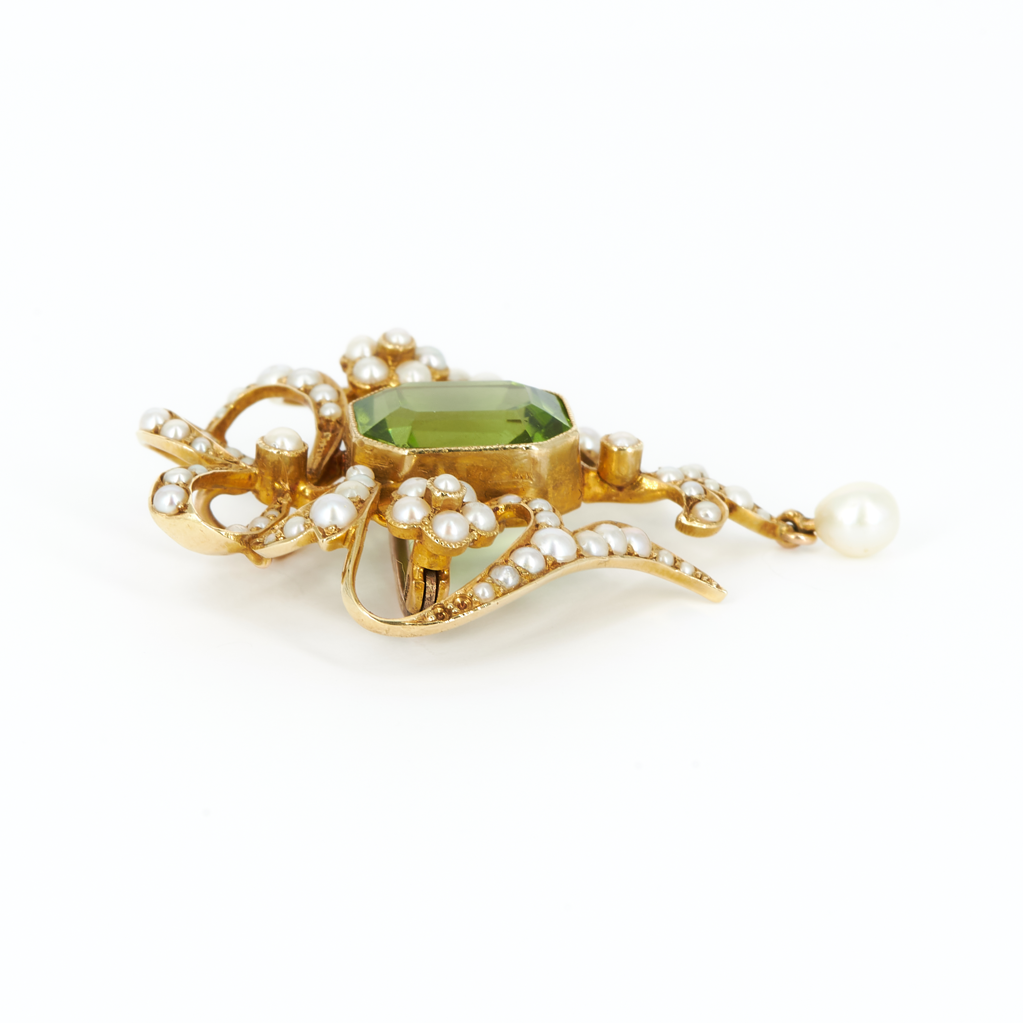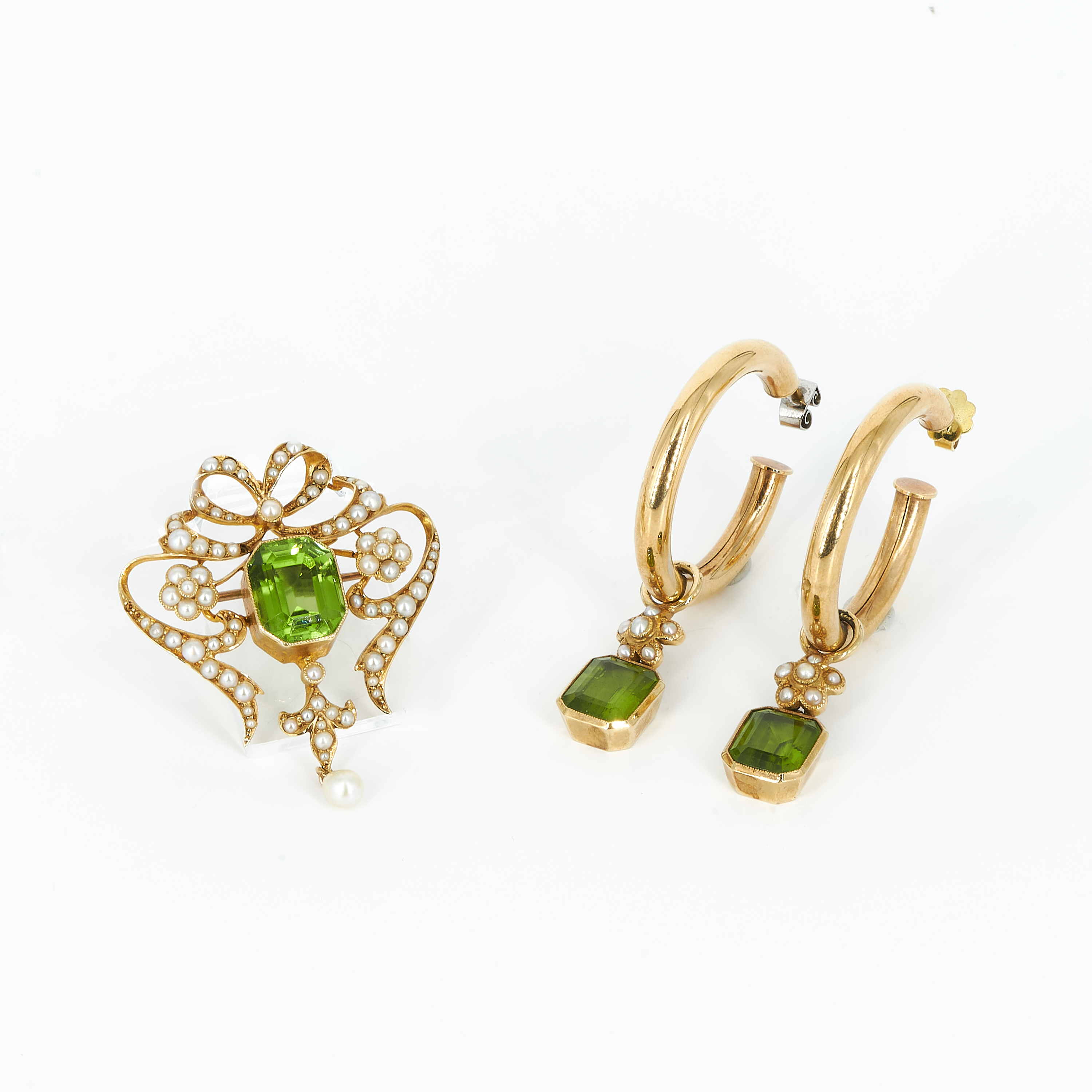PERL-PERIDOT-SET: BROSCHE UND OHRHÄNGER.