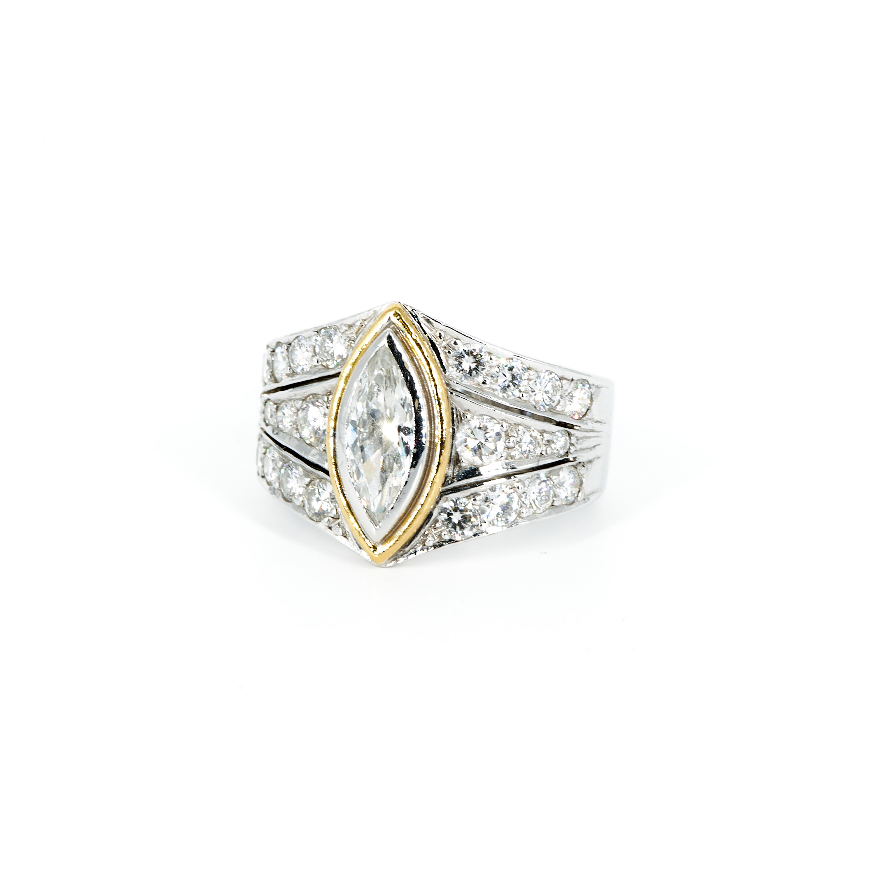 Diamanten: 1 Diamant im Navette-Schliff zus. ca. 0,4 ct., 22 Brillanten Ø ca. 1,2 - 2,6 mm, gute Qualität.